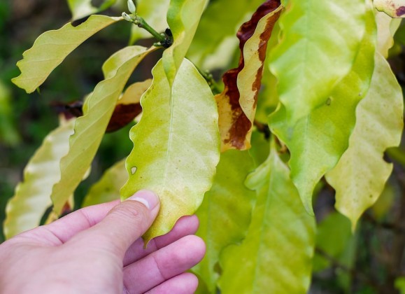Явное обесцвечивание и побледнение верхних или самых молодых листьев, которое не затрагивает старую часть кустиков или кроны и быстро переходит в побурение, всегда указывает на недостаточное количество железа.