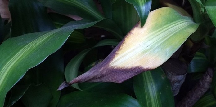 Начиная с самого края, листья постепенно бледнеют, без пожелтения буреют, но не на всей листовой пластине, а как будто наползая на края. Чаще всего процесс без стадии пожелтения затрагивает самые старые листья травянистых растений и нижние – комнатных кустарников. Такие процессы указывают на легкую нехватку калия.