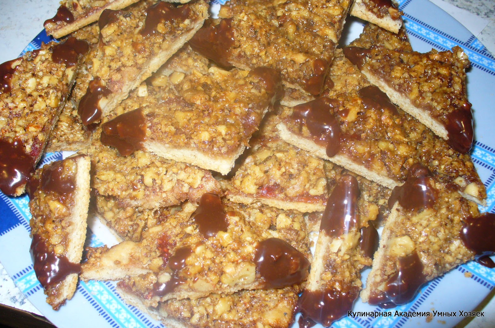 Не пересушите, печенье должно остаться мягким! Свежеиспеченный ореховый пласт, не остужая разрежьте сначала на полоски, затем полоски нарежьте на уголки.