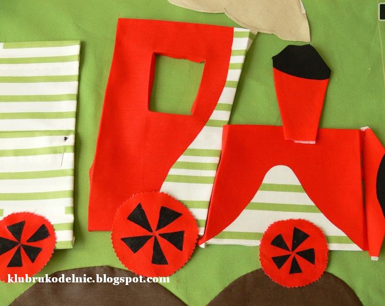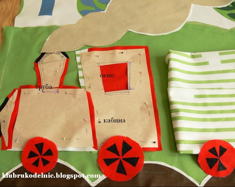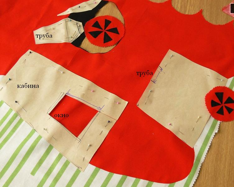 8. По приколотым шаблонам вырежем детали, прибавив на швы 0,7 см с краев. Детали положим на сшитую основу и примерим колеса. К трубе сделаем дым.