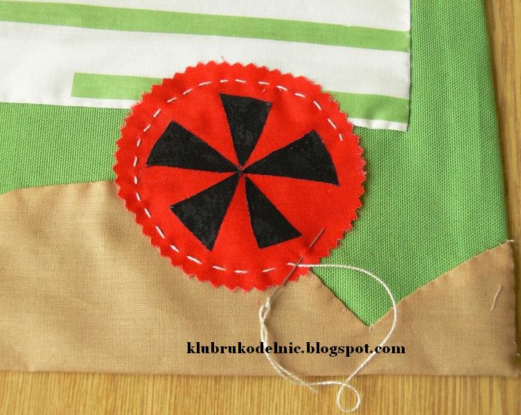 5. Верхние края кармашка два раза подогнем и приколем булавками к основе. Боковые и нижнюю стороны подогнем и пришьем вагон. Колеса можем вырезать зубчатыми ножницами из красной ткани. В середину вставим черные треугольники и приклеим их клеем для текстиля.