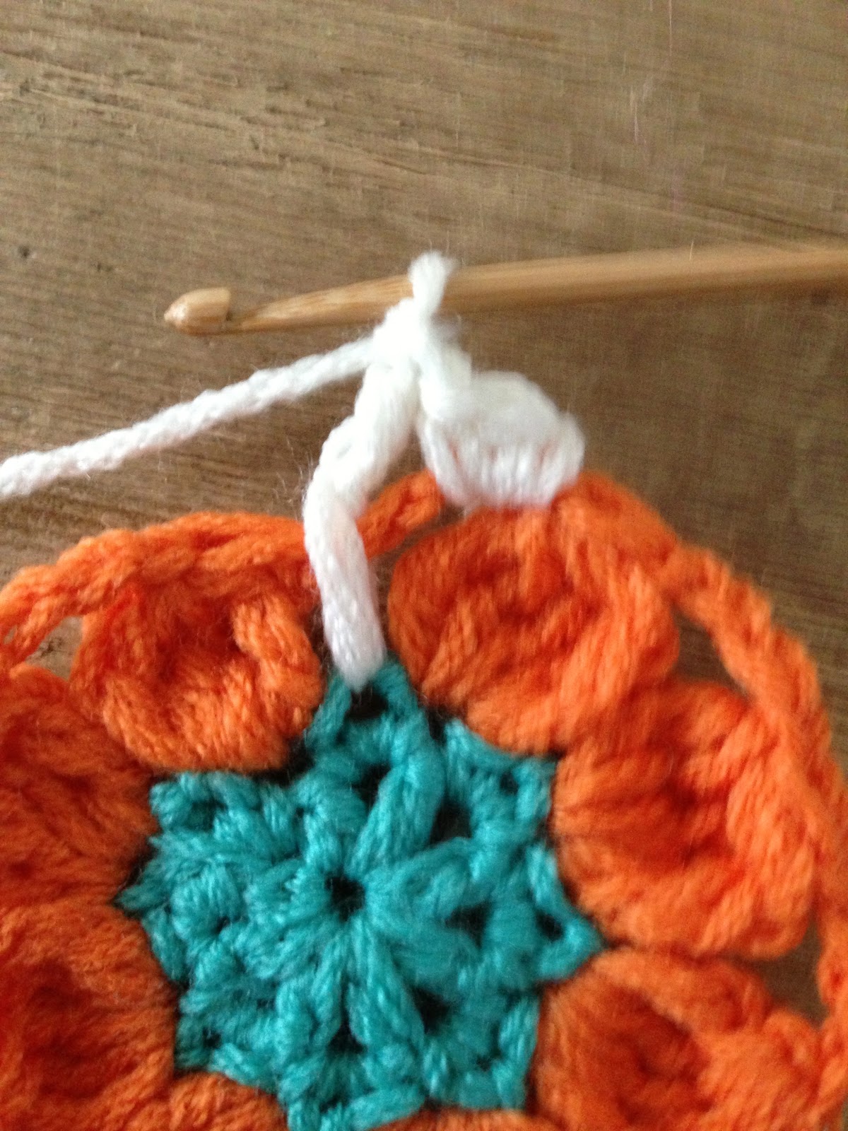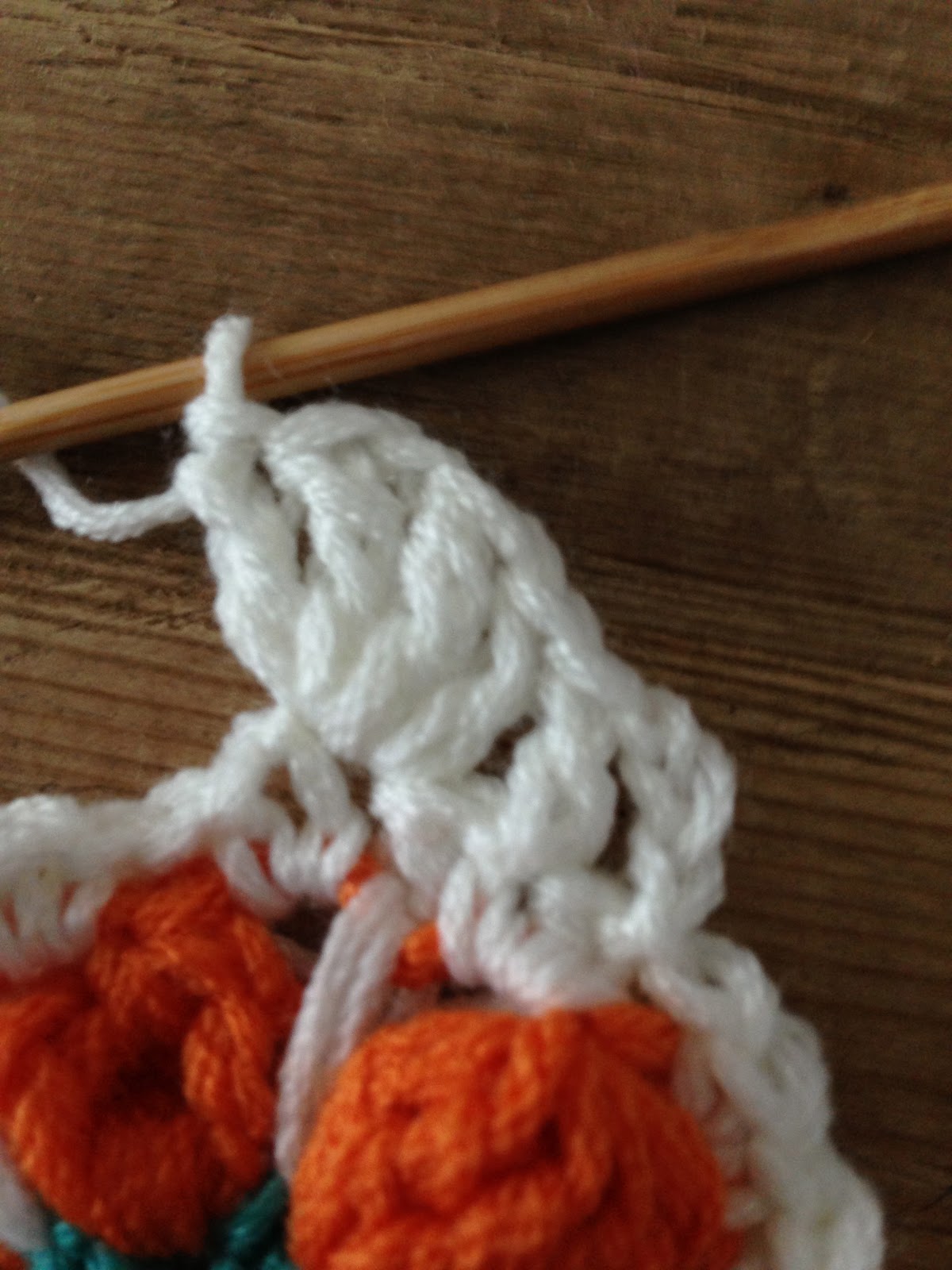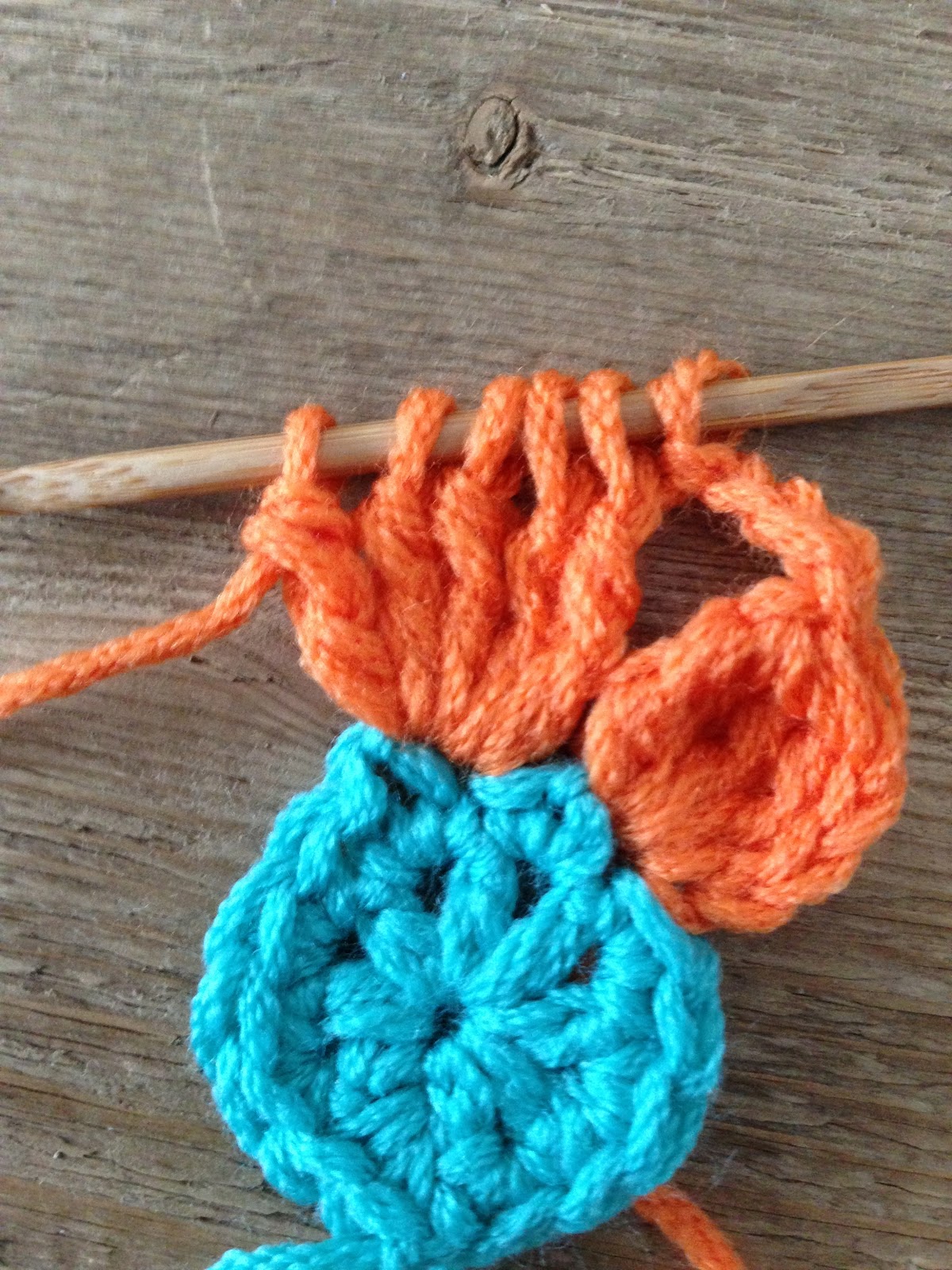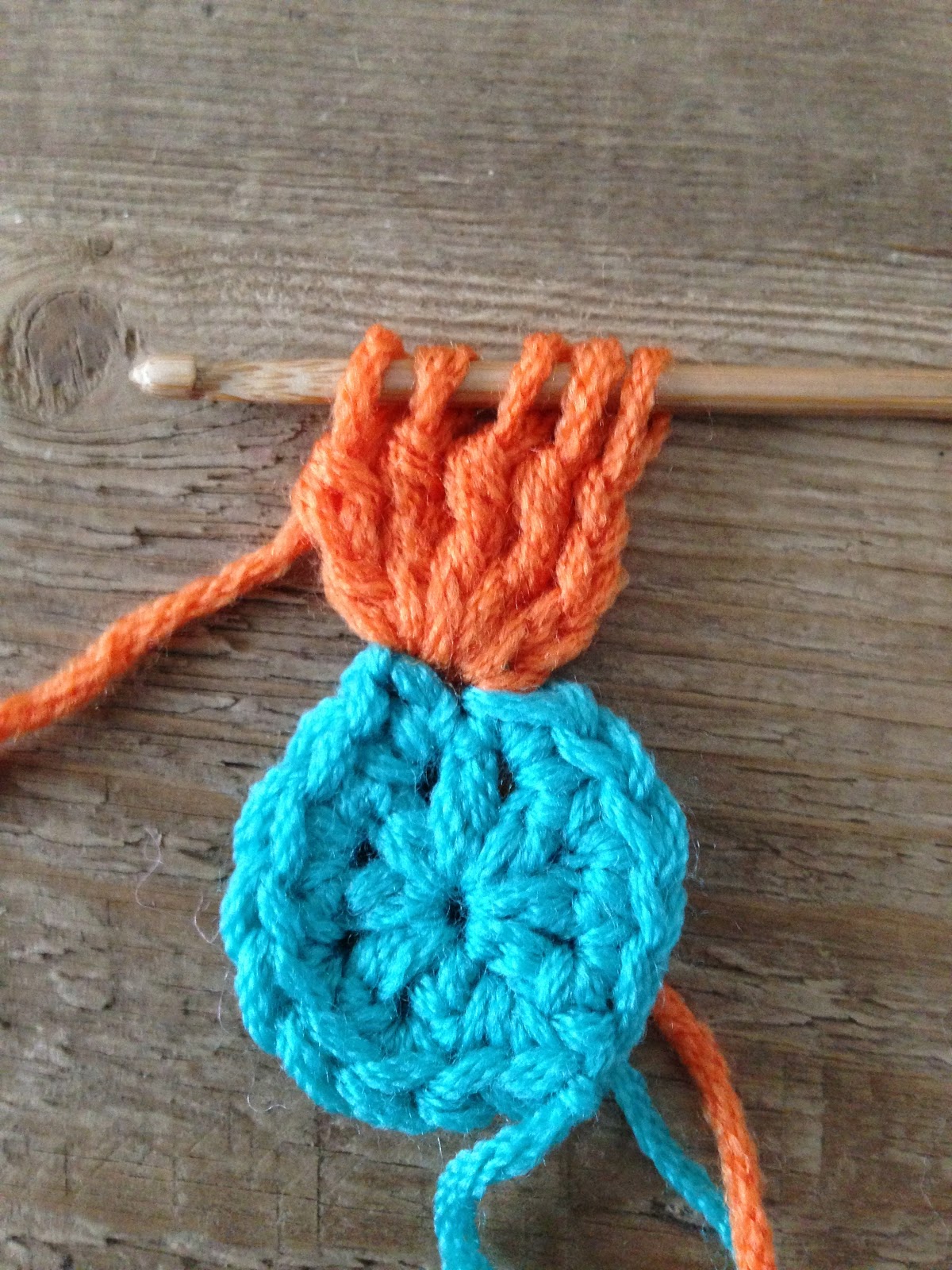 Раунд 3: Изменить цвет, в любом st, sl st и ch 4, это будет считаться как первый tr, [создать кластер с 5tr, ch4] 8 раз, sl-й в первой кластера. (Создание кластера, означает, что вы делаете tr, но не заканчивает последний пряжи, оставляя ее на крючке до тех пор, пока у вас есть 5 st на крючок, в нашем случае мы будем иметь 5st на нашем крюк плюс ch с ch 4, затем пряжу за все и сразу, поэтому создание кластера, см. рисунок)
