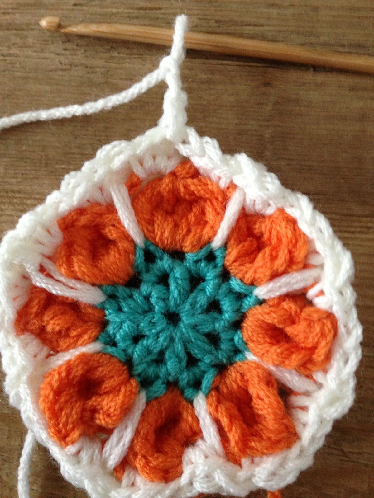 5 раунд: ch3, dc in next st, [постоянного тока, tr, ch, tr, dc], продолжить 2dc, 3hdc, ch, 3hdc, 2dc, [постоянного тока, tr, ch, tr, dc]) более 7 раз. sl-го по первый ch3. закреплять