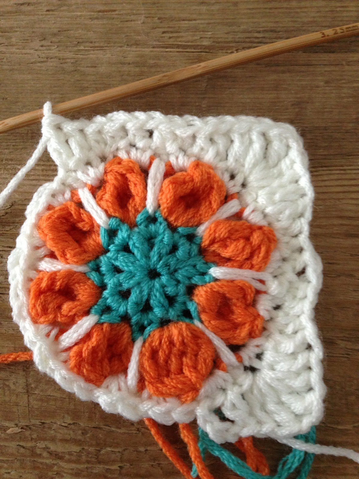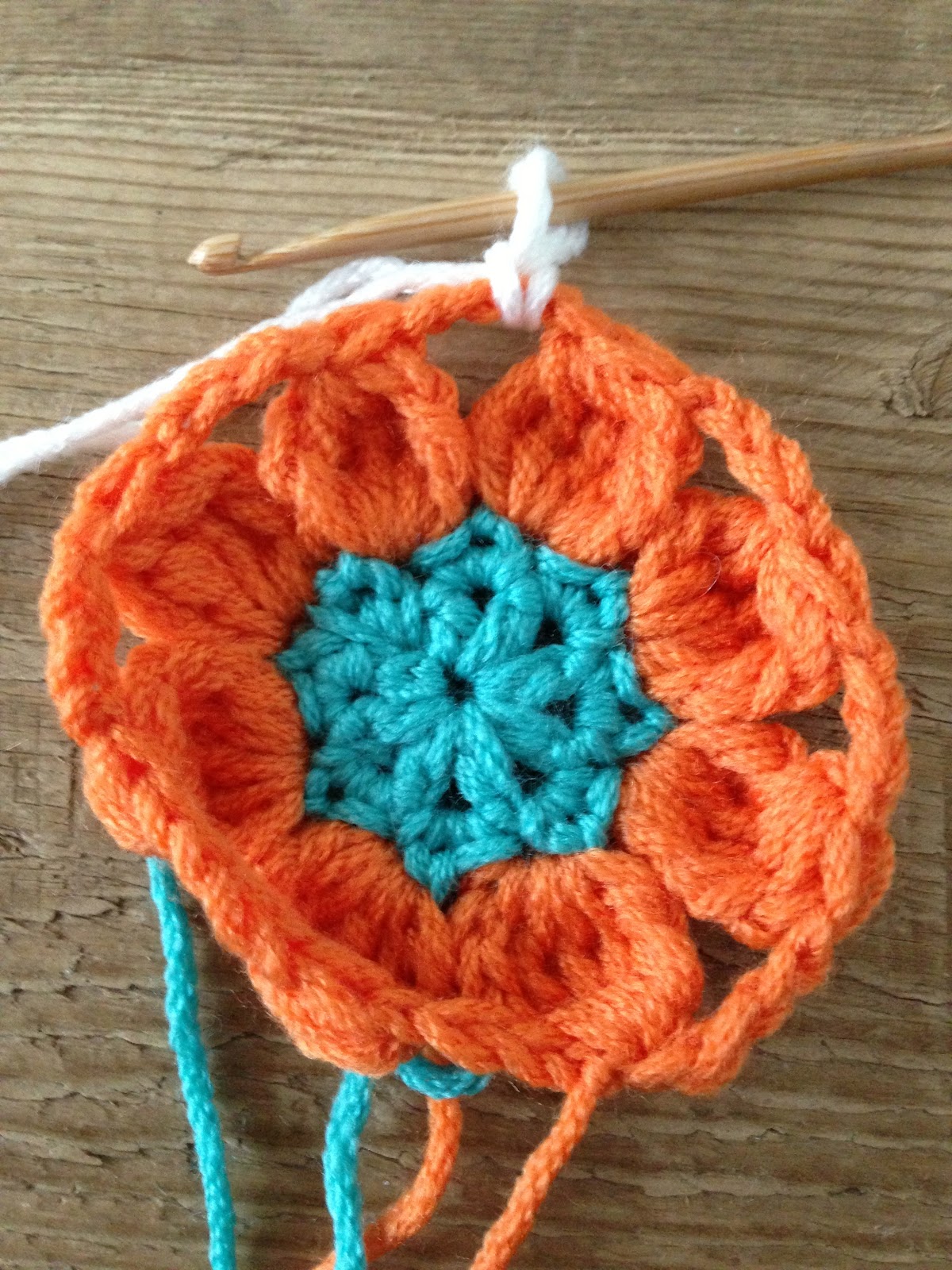Раунд 4: Изменить Цвет, в любом ch-4 sp, [2sc, tr в СК от 2-ом раунде здесь круглый голубой, 2sc снова в ch-4 sp, ch1, 2sc в следующем ch4 sp] 8 раз.