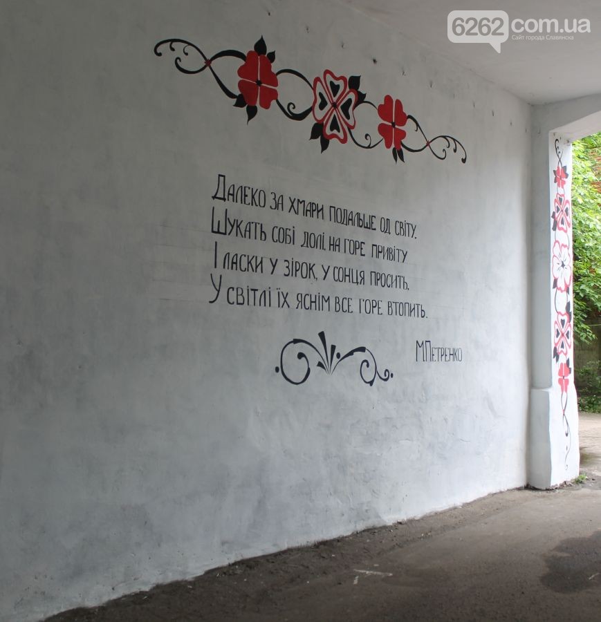 Розпис стін віршами відомих поетів - досить нова течія в Україні. У нашому місті ініціативна молодь з "Теплиці" вирішила започаткувати подібне мистецтво у Слов'янську. Молодь обрала одну з центральних вулиць міста - Університетську. Арку одного з будинків прикрасили віршами нашого земляка - поета зі Слов'янська Михайла Петренка. Чудові рядки відомого вірша "Дивлюсь я на небо..." доповнили елементами укрїнського розпису. Жителі будинку приємно вражені новаціями.