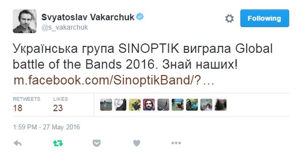 Украинская группа SINOPTIK стала победителем международного конкурса The Global Battle Of The Bands. Об этом сообщается на странице музыкального чемпионата в Фейсбуке.