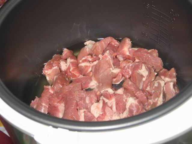 В кастрюлю наливаем растительное масло 3-4 столовые ложки. Закладываем в кастрюлю мультиварке мясо. Соль, приправы.