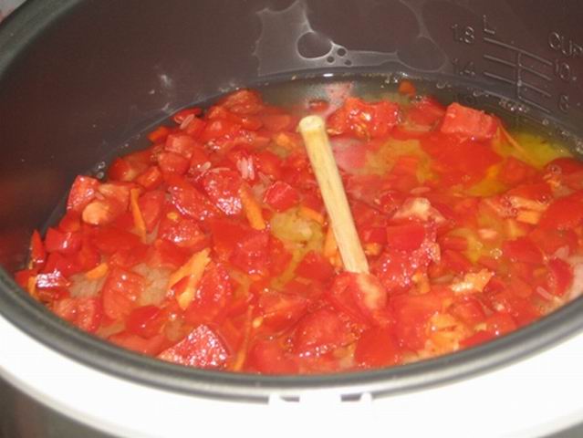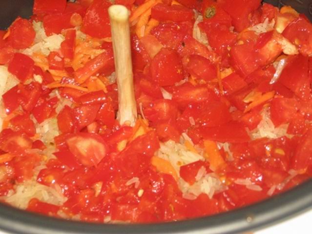 Потом болгарский перец и помидоры по желанию. Втыкаем головку чеснока полностью. Нарезанные помидоры и болгарский перец по желанию.