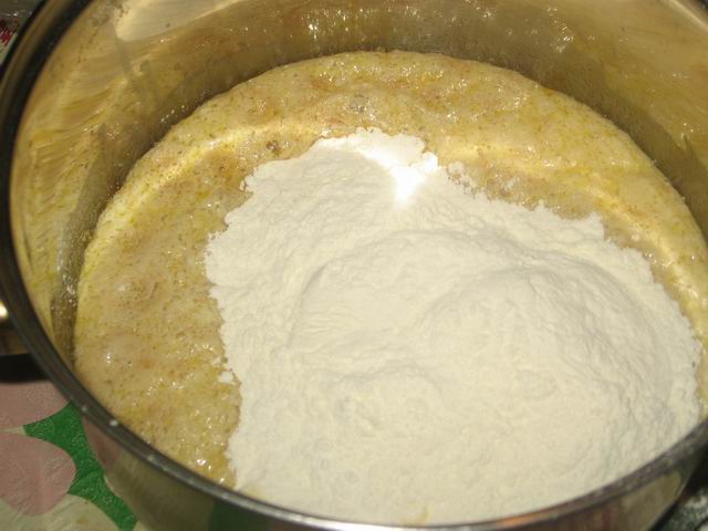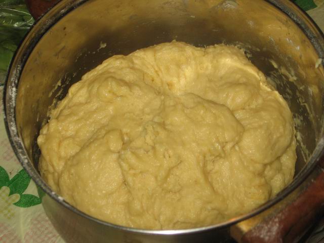 постепенно добавлять муку, замешивая тесто. Месится просто, к рукам и стенкам посуды не прилипает,