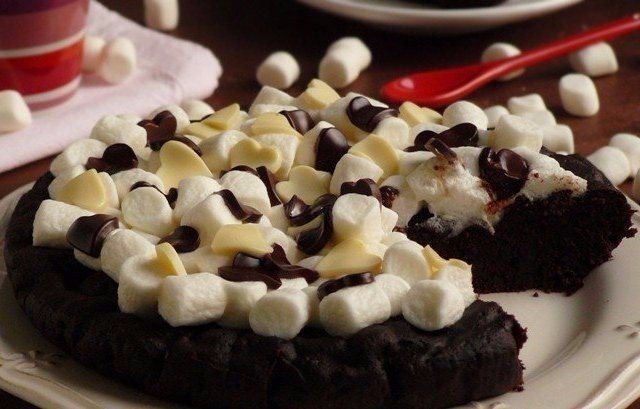 Измельчи руками крекеры, а затем смешай их с растопленным маслом. Смесь необходимо выложить в форму и равномерно распределить по поверхности. Теперь убери ее на час в холодильник. В большой миске взбей сливочный сыр, сгущенное молоко, арахисовое масло и сахарную пудру. Затем добавь сливки, тщательно перемещай и залей этой смесью корж. Потом убери готовый торт в холодильник на 3 часа. Перед подачей сбрызни торт растопленным арахисовым маслом и укрась маршмеллоу.