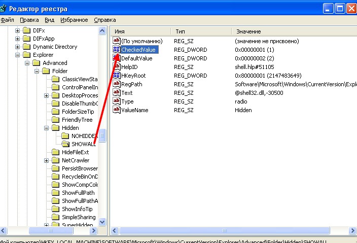 \Advanced\Folder\Hidden\SHOWALL параметр CheckedValue, если значение 0 , смените на 1 .