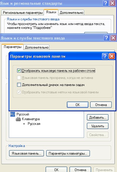 Ставим галки в "Отображать языковую панель на рабочем сто ле"