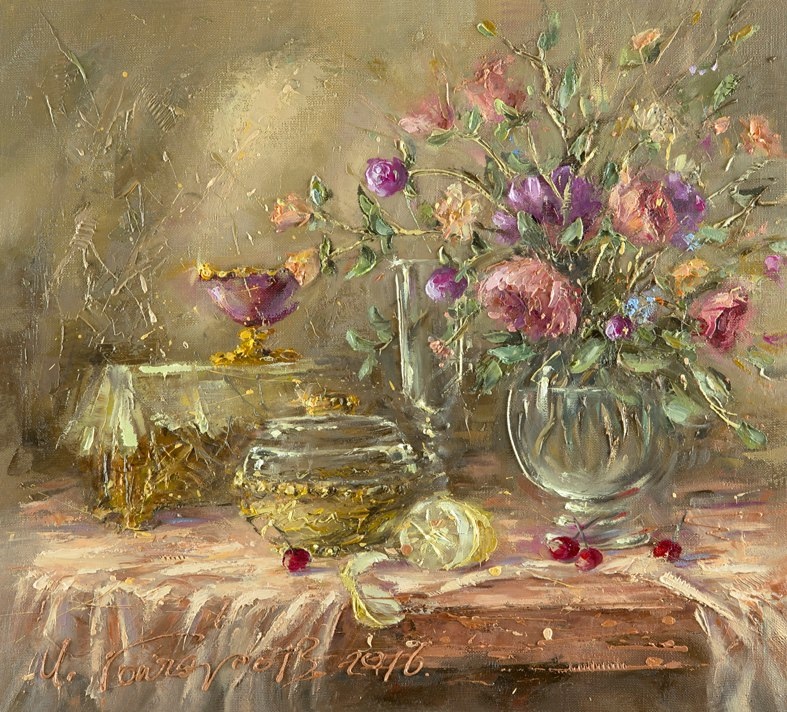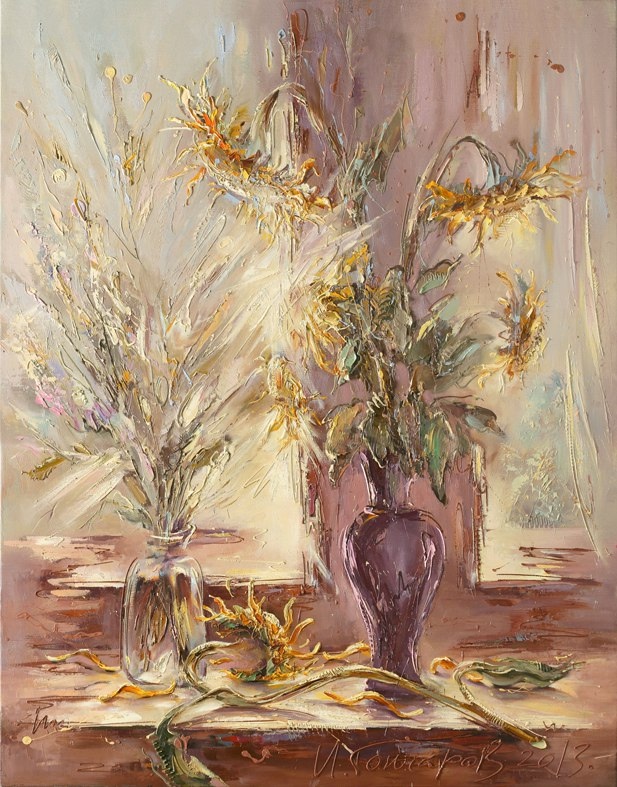 Картины Гончарова, декоративность которых основана на пластических деформациях и виртуозном владении техникой рельефного мазка, способны менять цвет и вид в зависимости от разных углов освещения картин. Радует затейливая игра линий - то забавно упрощенных, то тревожно прихотливых, восхищают цветовые вариации - от сдержанно благородной гаммы до радужно мозаичной палитры.