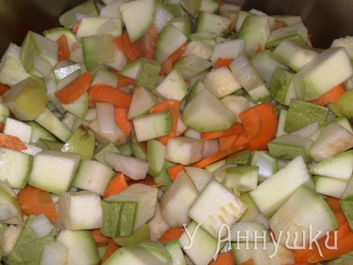 Овощи нарежьте кубиками разного размера, в зависимости от времени приготовления каждого овоща. Мельче всего – морковь, немного крупнее – лук, затем – кабачки и крупнее всего – яблоки. Я этого правила не соблюла. В итоге, кабачки были уже готовы, а морковь – еще нет.