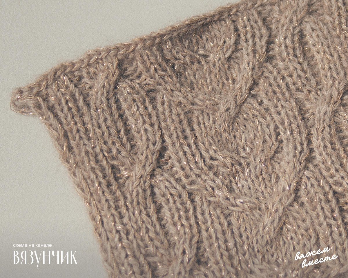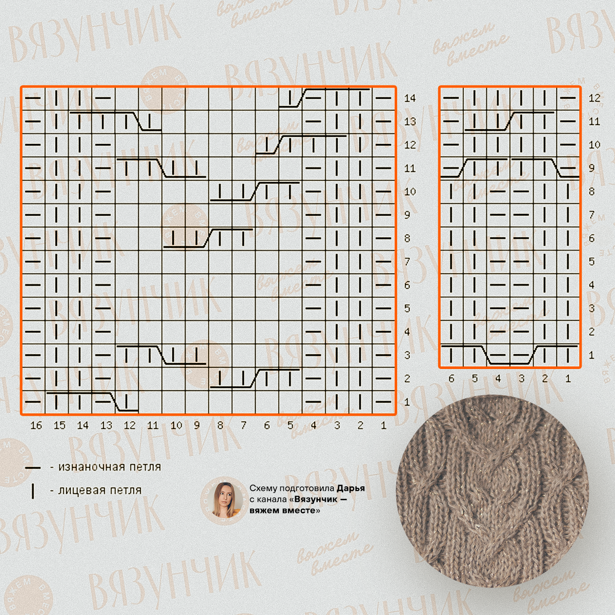 Я говорю о 12-13 и 14-1 рядах, в которых мы перекрещиваем 3 петли с одной. В первом случае мы в процессе перекрещивания делаем из изнаночной петли лицевую, а во втором — наоборот.
