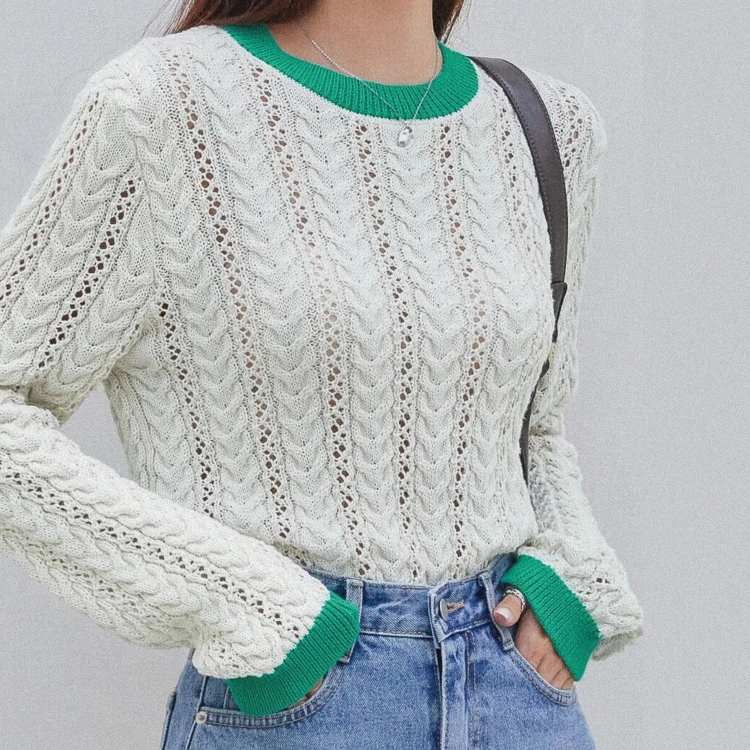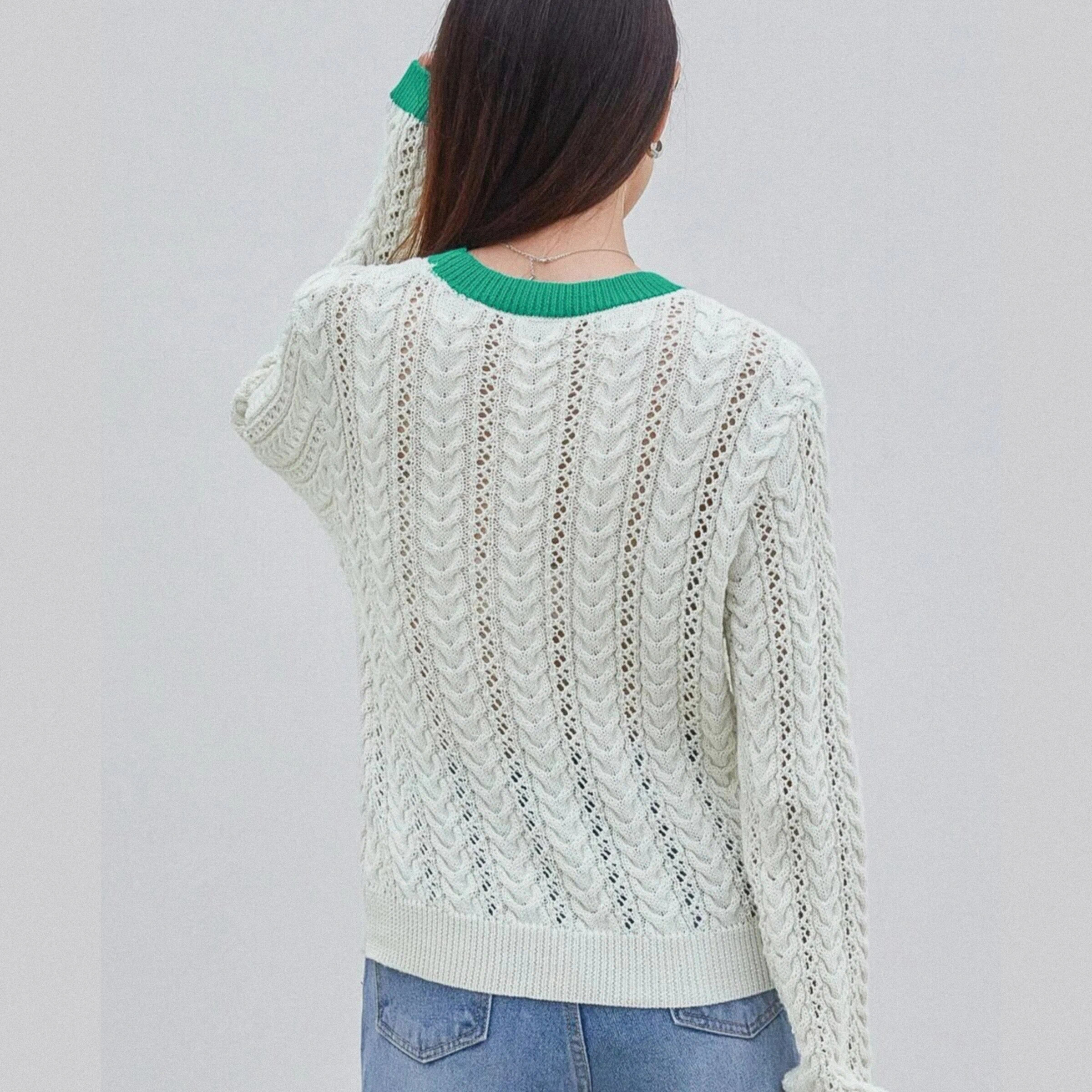 Интересная находка с сайта Шейн — джемпер с вертикальными косами и разделяющими их ажурными дорожками, а также с контрастной отделкой горловины и манжет. Составляя противоположность белой пряже отделка в джемпере и джемпер в целом смотрится заманчиво и разнообразно.