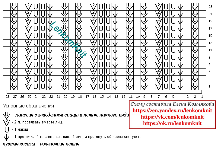 На схеме нарисован узор, который вяжется с правой и с левой стороны переда и спинки. Раппорт узора в высоту – два ряда, лицевой и изнаночный. В ширину эти “вставки” составляют 28 петель. Между ними – полупатентная резинка.