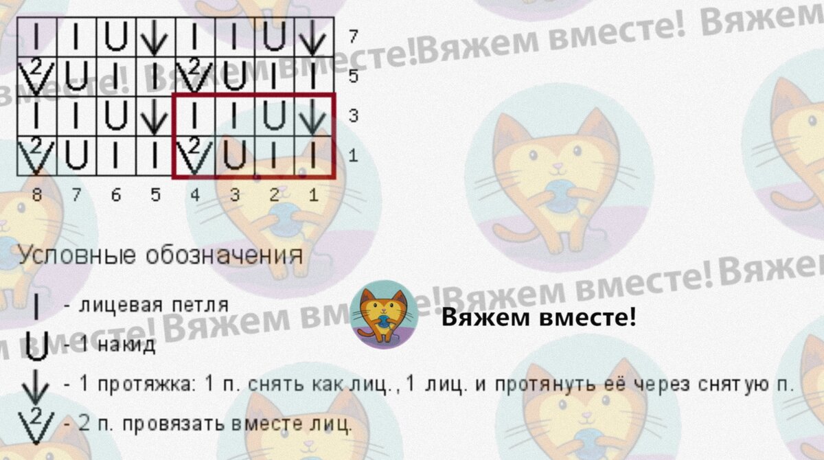Узор вяжется предельно просто. Раппорт состоит всего из 4 петель по ширине полотна и из 4 рядов по высоте.