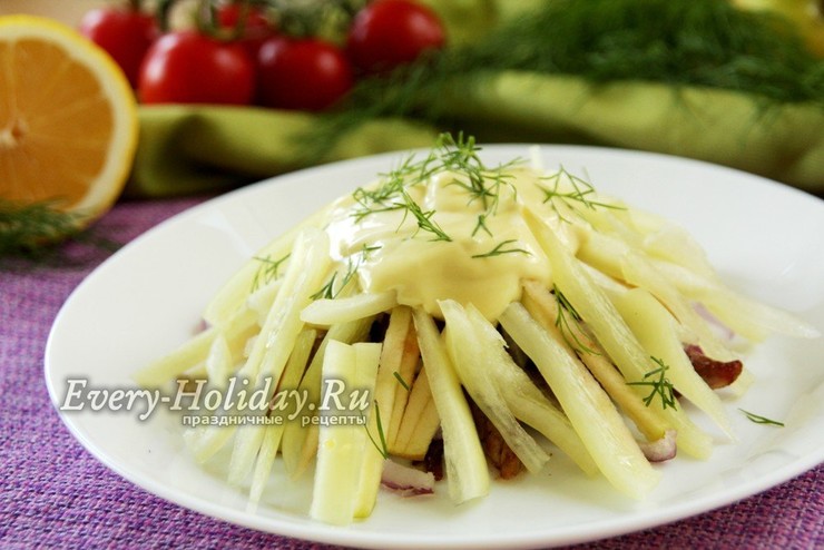 Продукты для этого рецепта самые простые. Грибы подойдут любые. Использование лесных грибов сделает ваш салат более «сказочным».