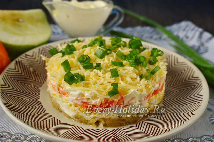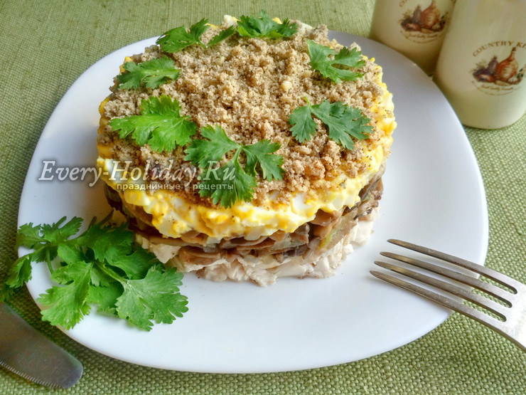 Выглядит такой салат привлекательно и аппетитно, потому что формируется в виде слоев. |