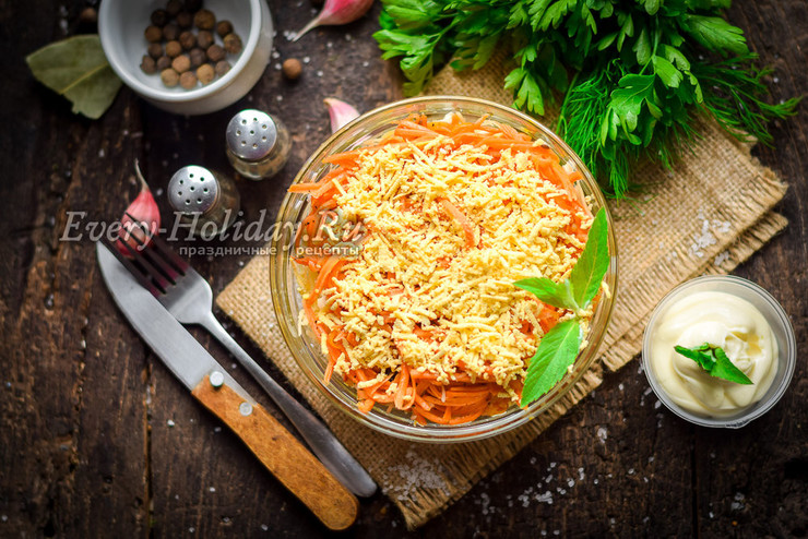 Такой салат получается очень сытным, помимо основных ингредиентов в нем присутствует сыр и куриные яйца, заправка майонезная.