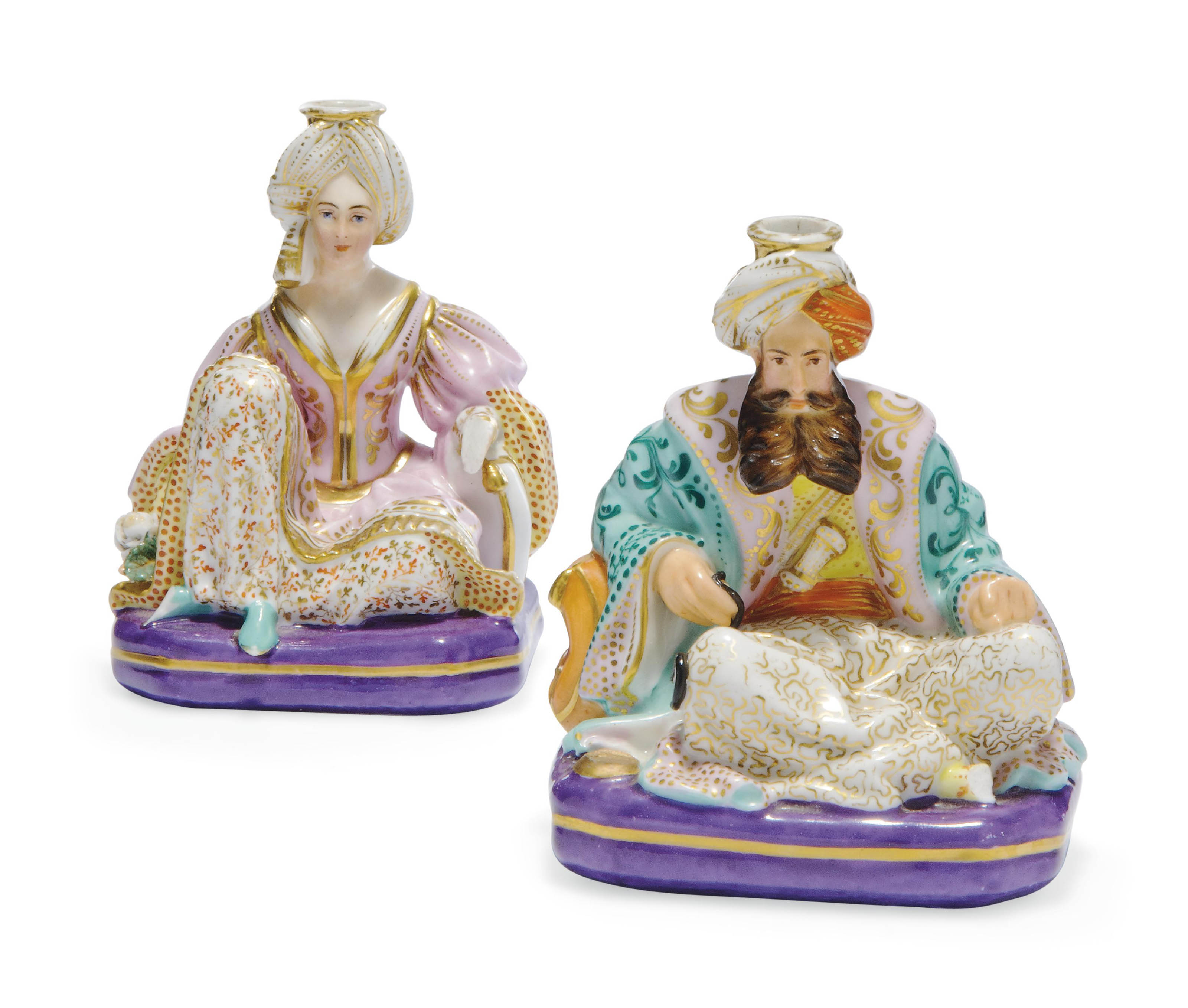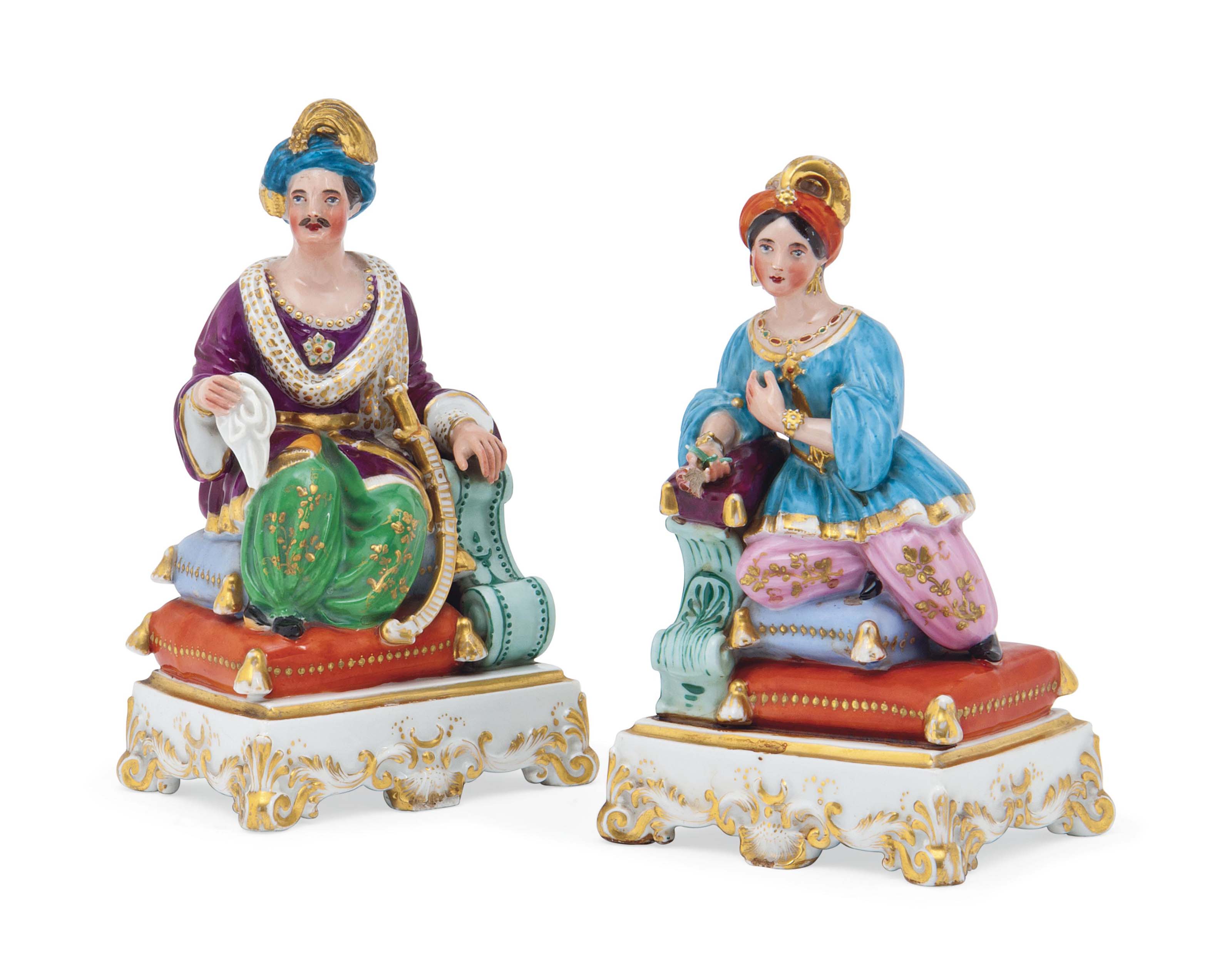 Пара фарфоровых фигурок Оттамана Якоба Пети, изображающих султана и султаншу, украшенных полихромом и позолотой с пометкой jp на основании.