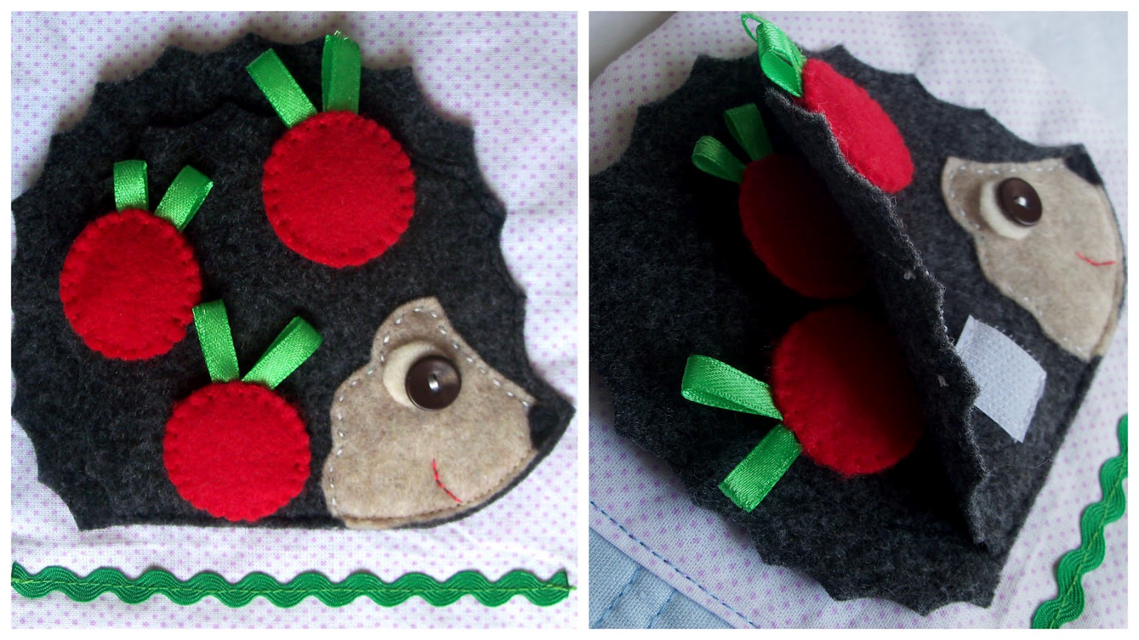 Ежик несет яблочки - яблочки на липучке, снимаем и прячем в "кармашек".