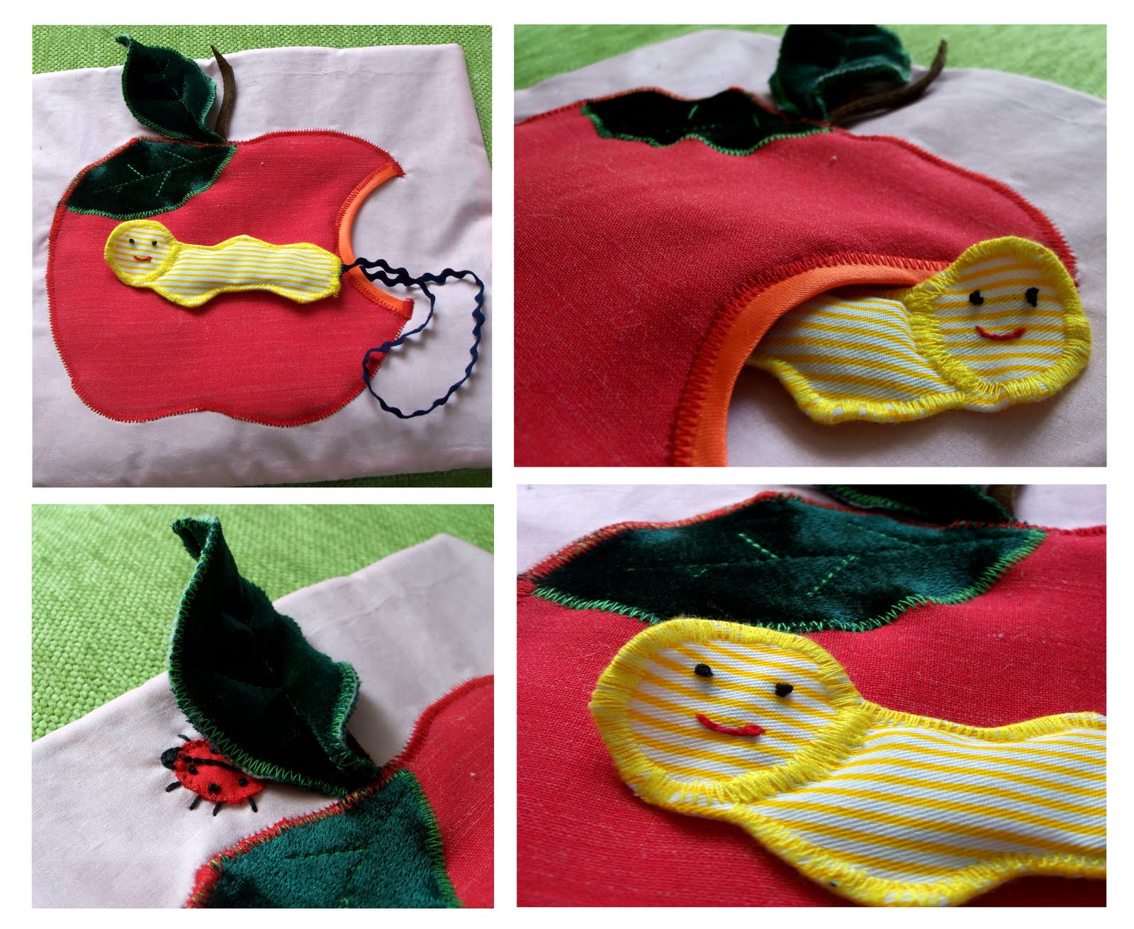 В груше прячется червячок. Тренируем пальчики - вытаскиваем и прячем обратно. За листик и хвостик можно просто подергать. Ну и жучок для тактильных ощущений.