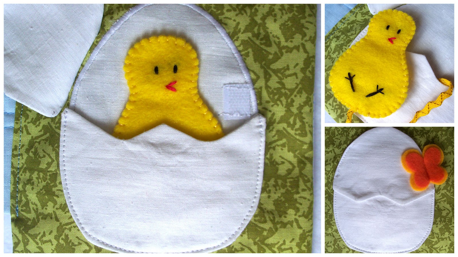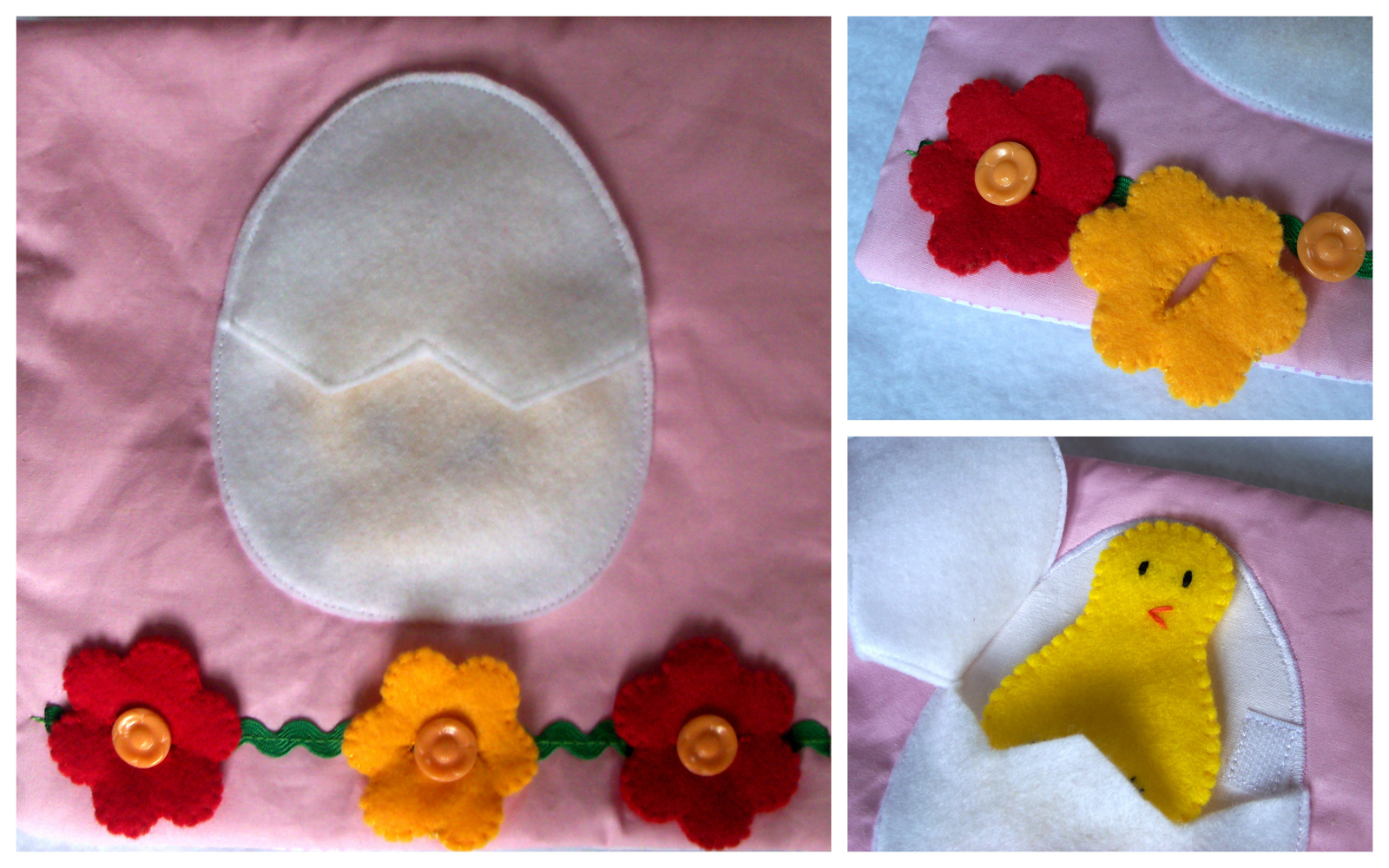 Четвертая страничка - яичко с цыпленком. Дополнительно сделала цветочки на пуговках, ну чтоб интересней было :)