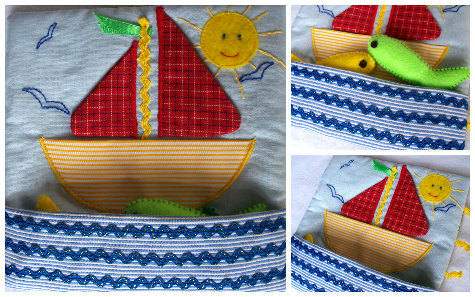 Кораблик сделан как кармашек, можно покатать кого-то из игрушек. За парусом спряталась чайка.