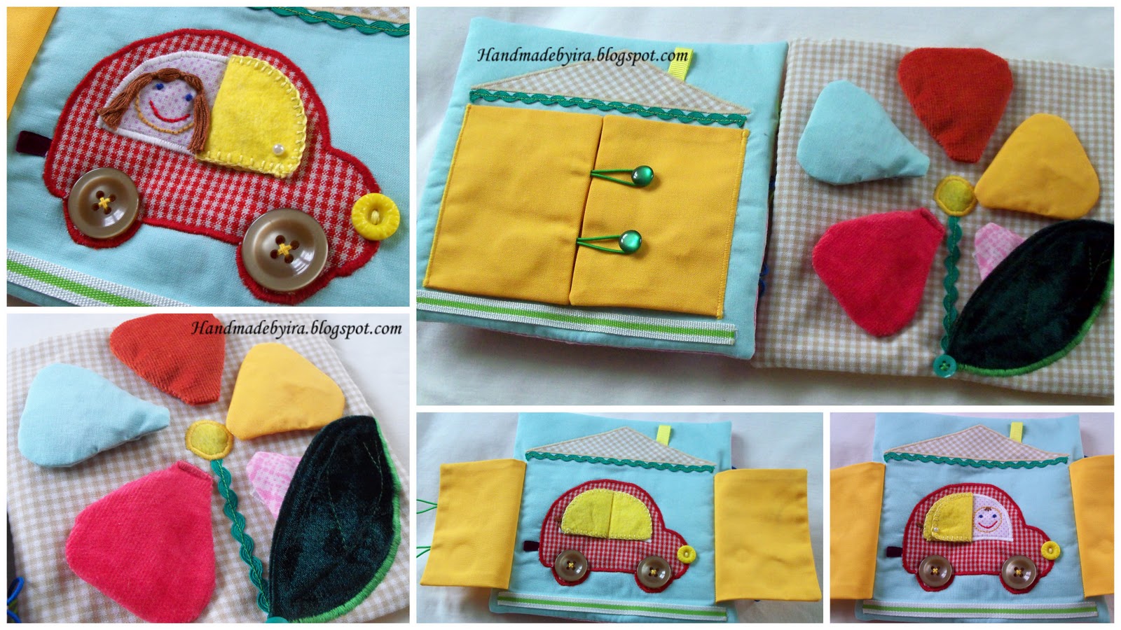 Следующая страничка - машинка. В машинке - братики-близнецы :). Гараж застегивается на пуговки, колеса тоже на пуговках.