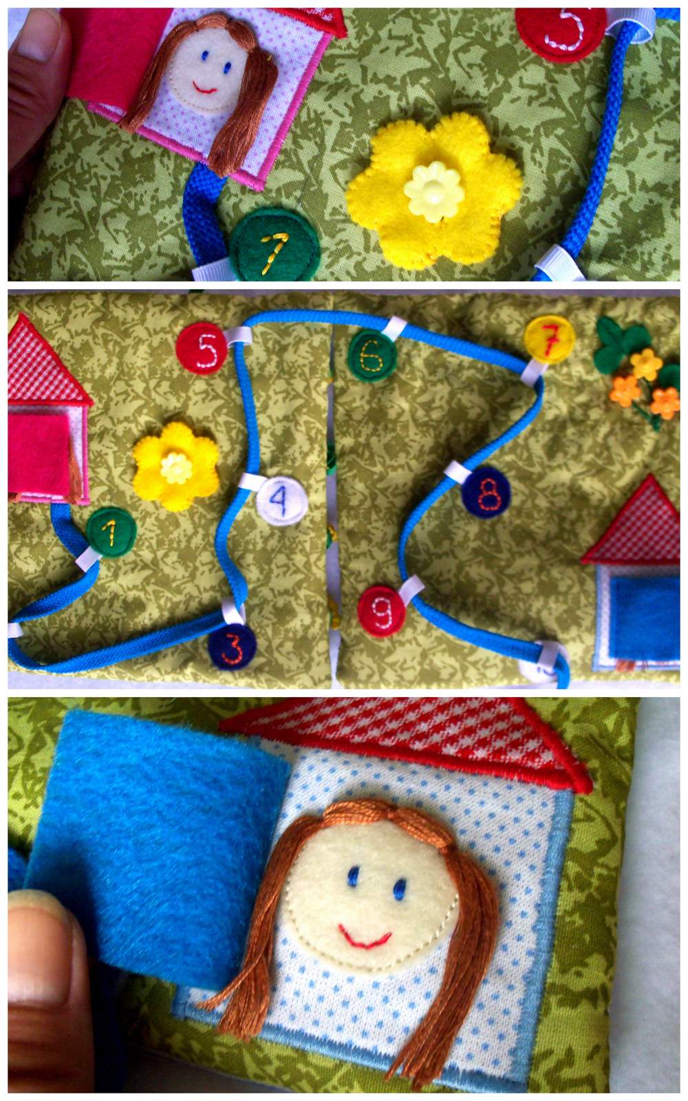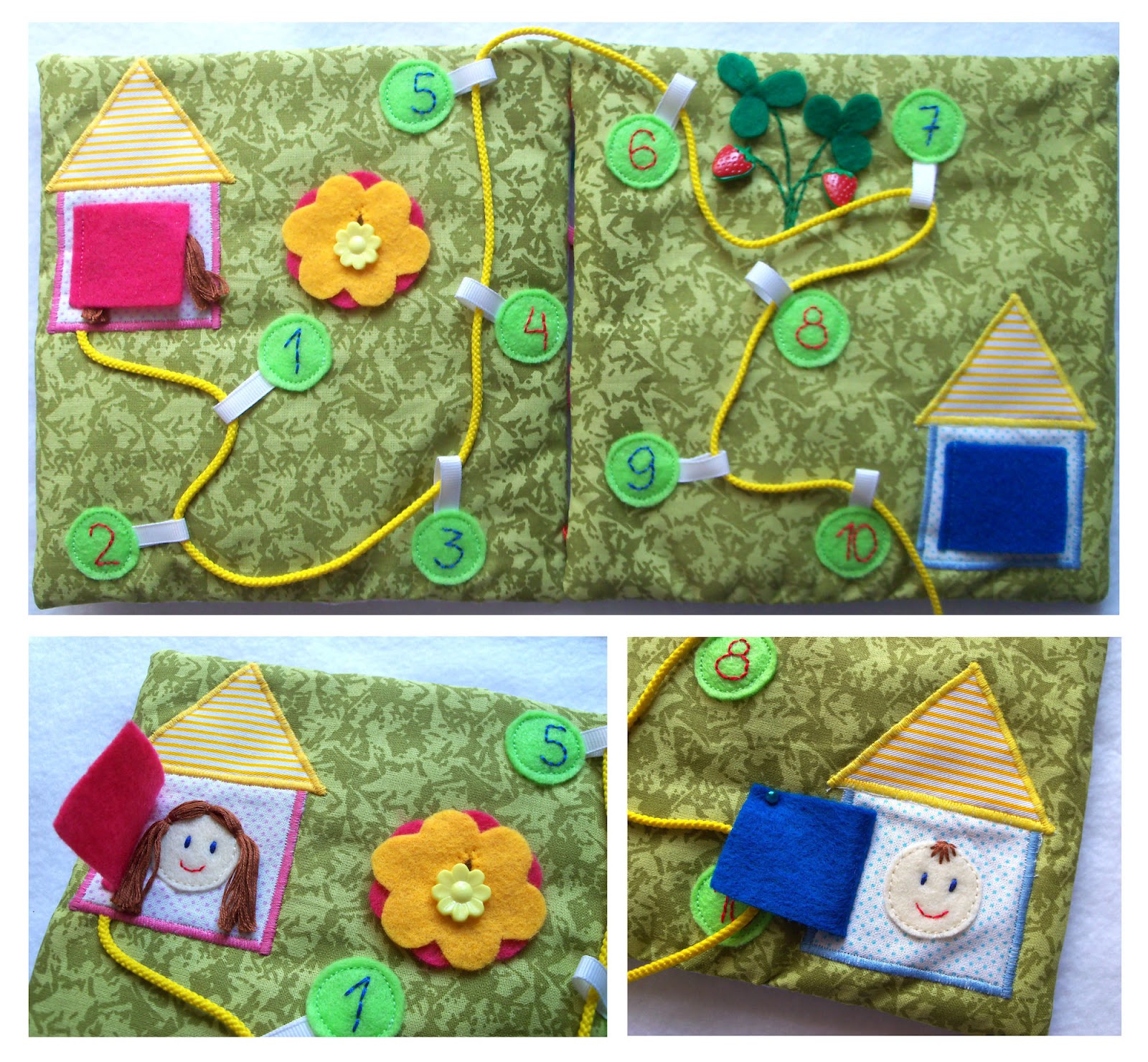 Цветок на пуговке - опять-же тренируем маленькие пальчики. А клубничка просто для разнообразия тактильных ощущений.