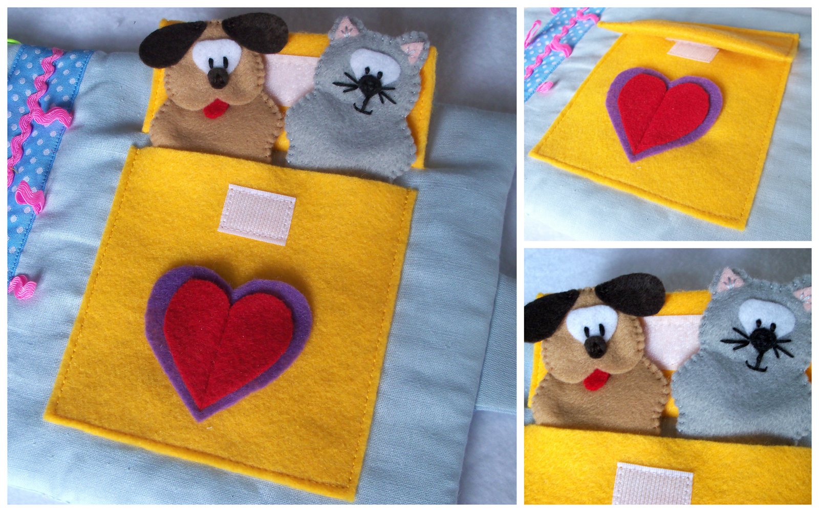 На последней страничке - кармашек, в котором прячутся собачка и кошечка - пальчиковые игрушки.