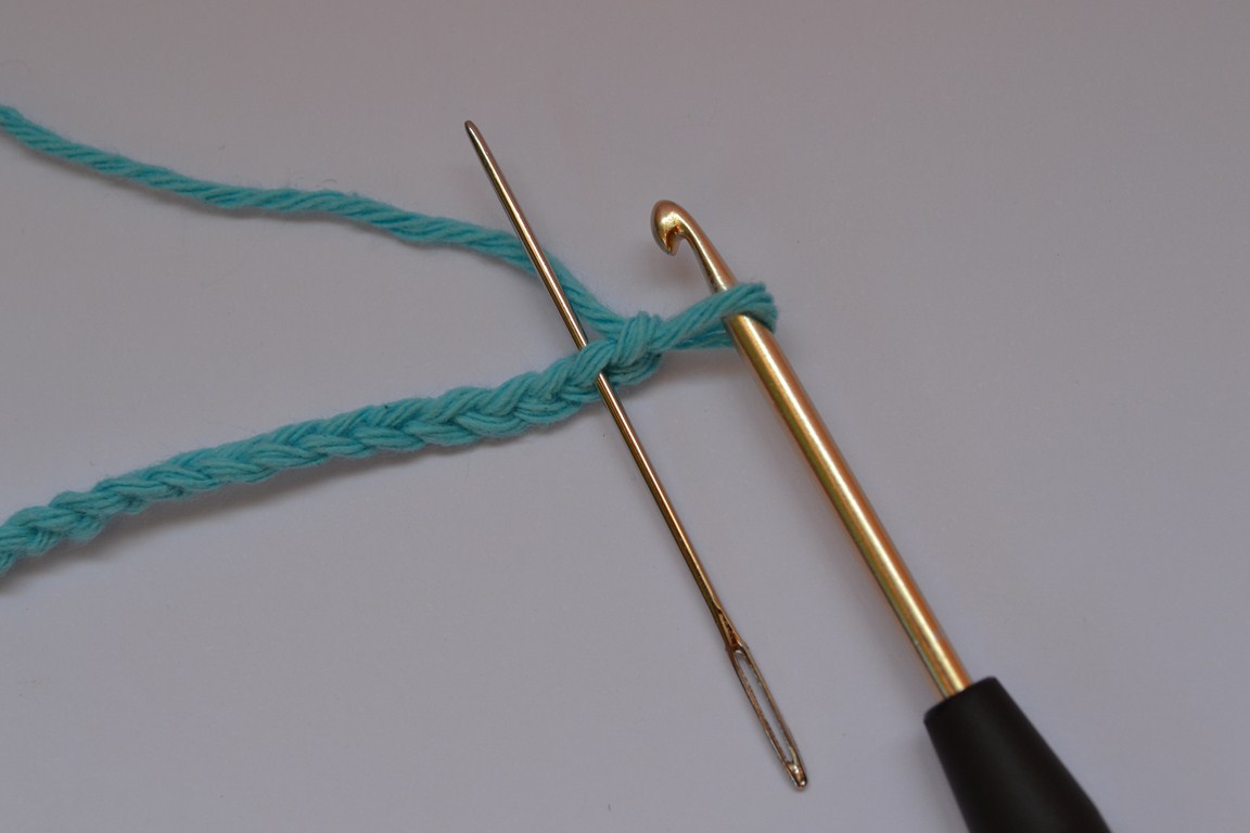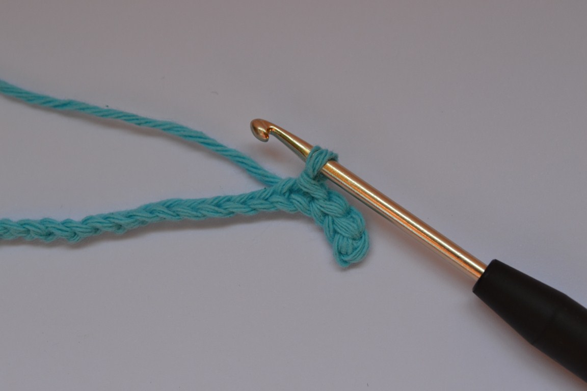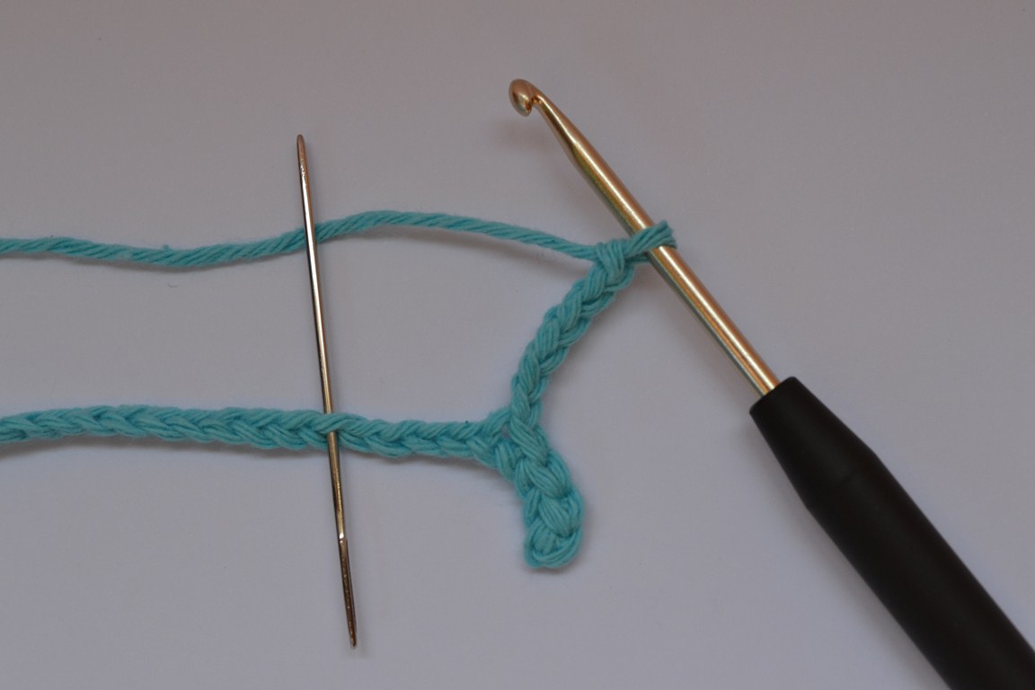 Начиная со второго цепного стежка от крюка слева (указано стрелкой), сделать 4 крючков.
