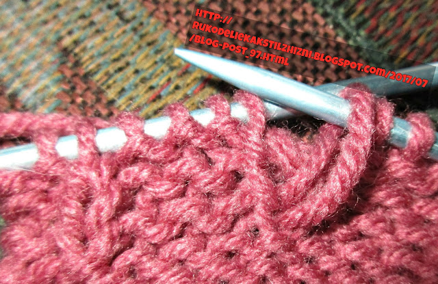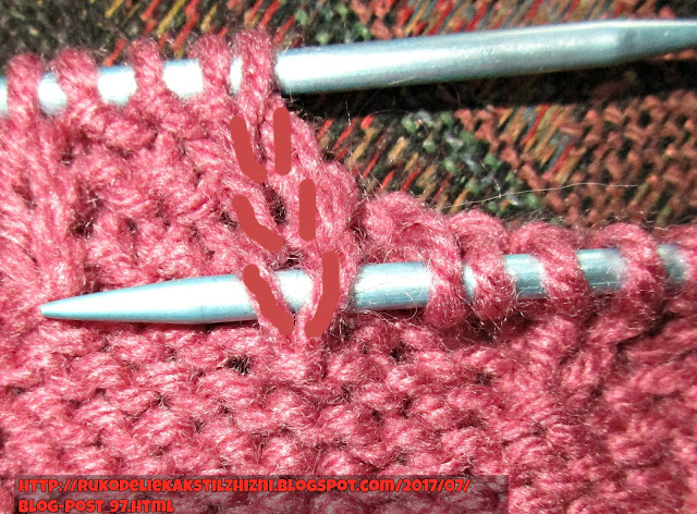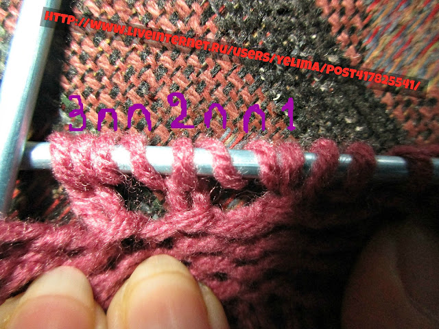 И действительно, мы как бы прокалываем полотно спереди-назад в области третей низлежащей петли, и-вытягиваем ''на себя'' полученную петлю.