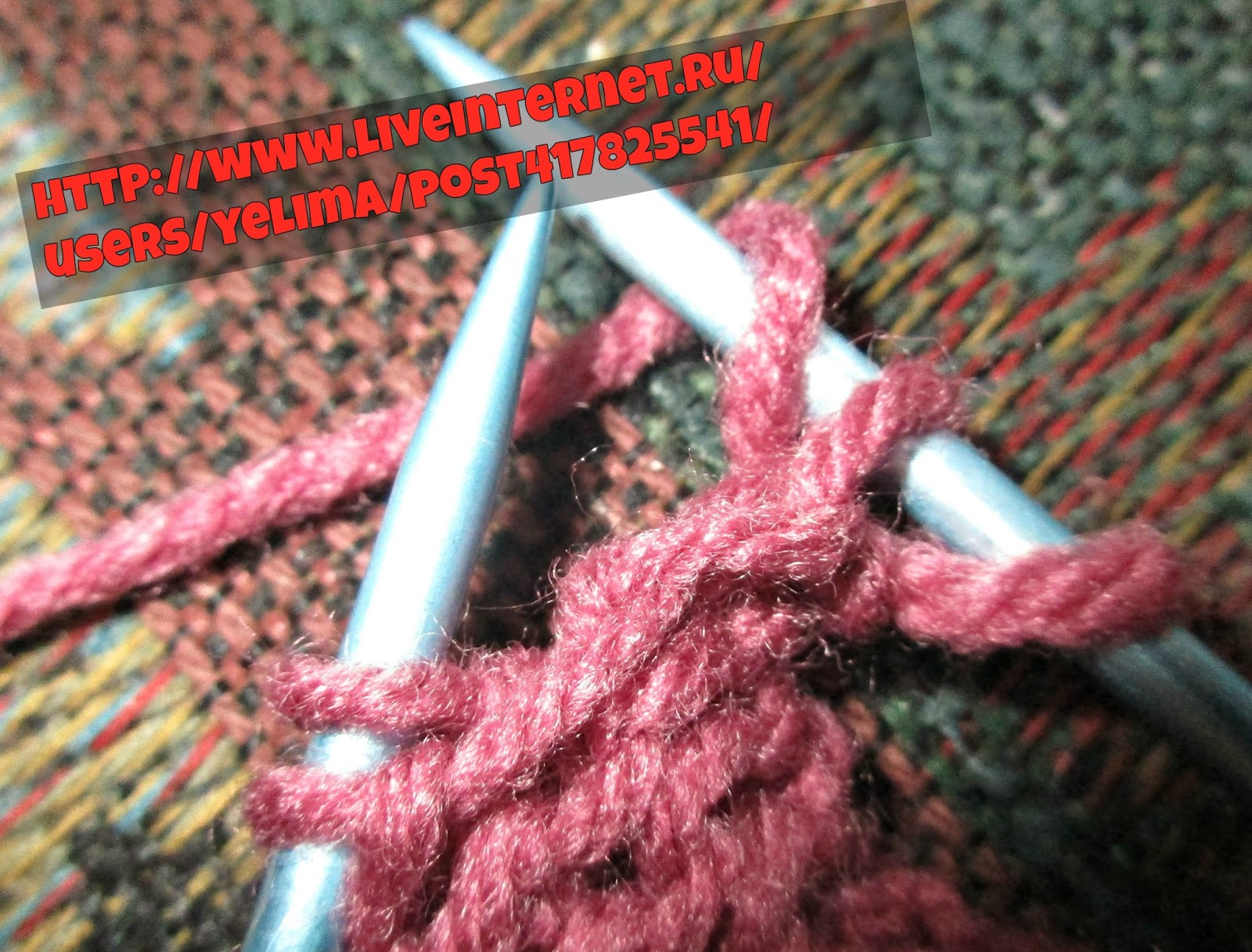 По крайней мере, лет 20-30 назад таких петель в узорах не встречалось. Заводим левую спицу между первой и второй петлями на правой спице с лицевой стороны, и вытягиваем петлю.