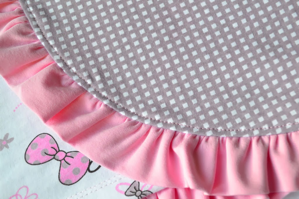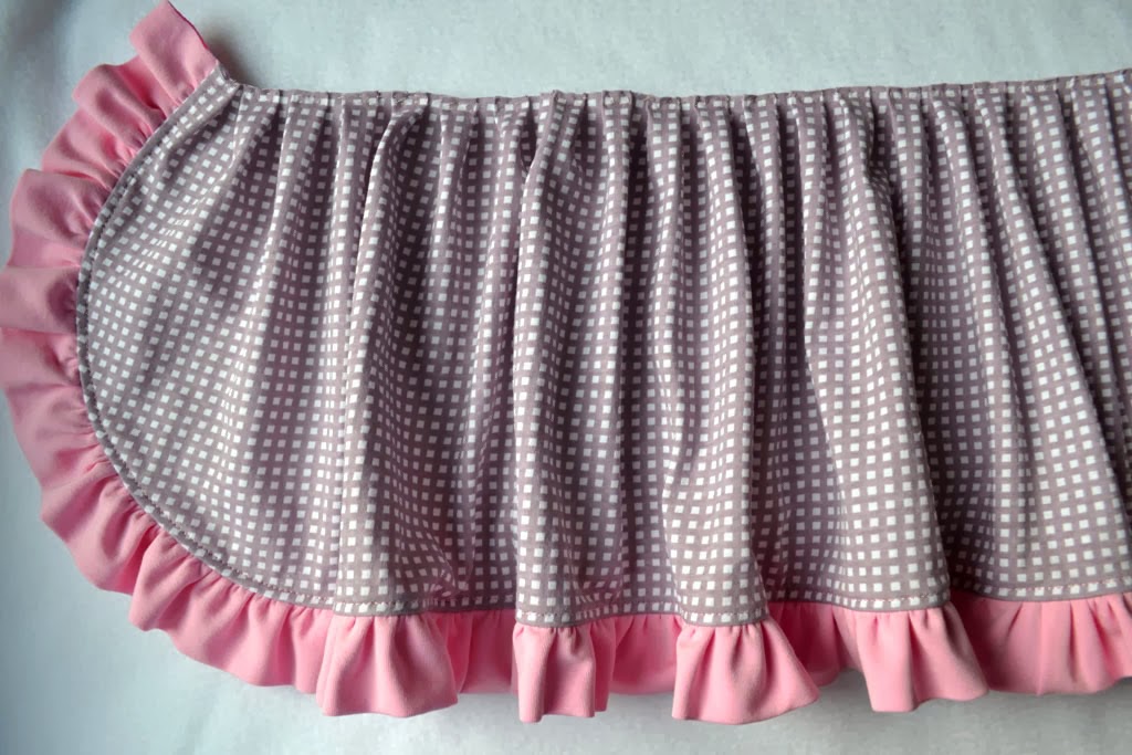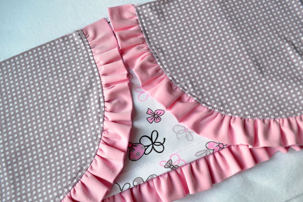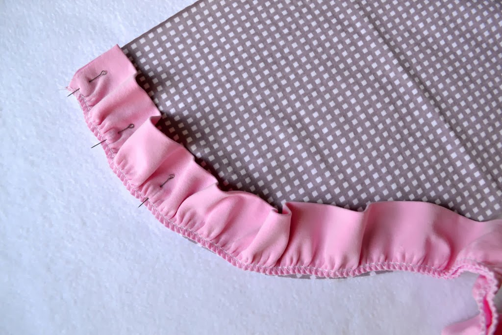 Прикалываю/ приметываю волан к нижнему срезу верхней юбочки, пришиваю на оверлоке.
