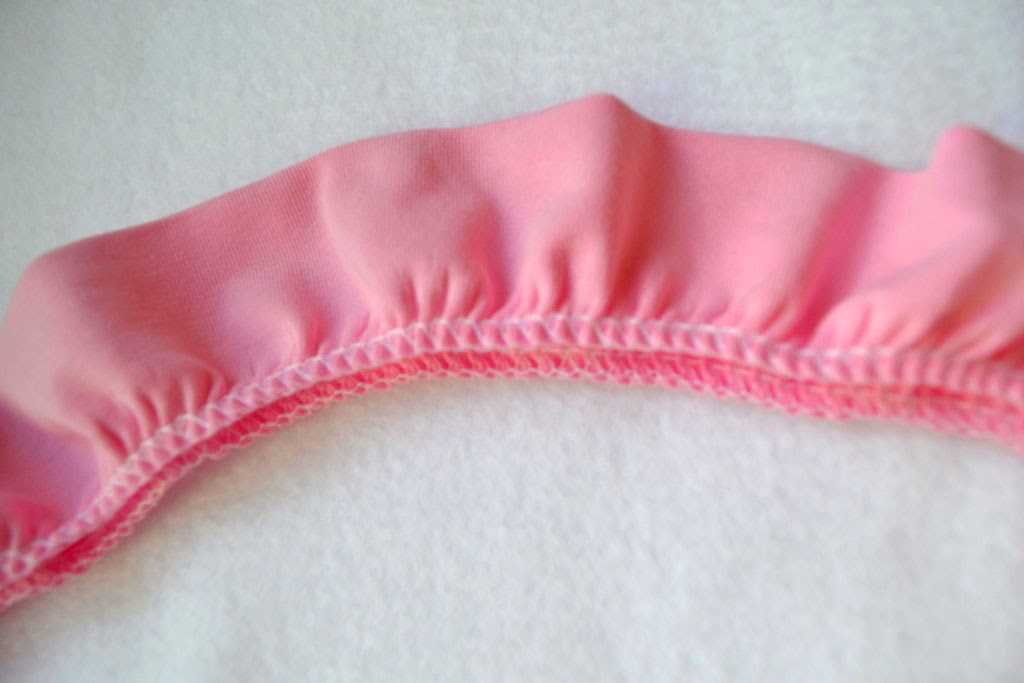 Волан собрала на оверлоке, выставив соответствующие настройки длины стежка и дифференциала. Пришлось оба среза проходить по отдельности, потому что оверлок с тканью в два слоя делал маленький коэффициент сборки, да и таким способом воланчик получился пышнее.