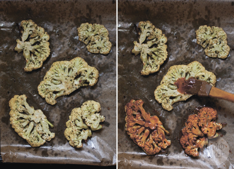 Через некоторое время поверхность капустных «стейков» слегка подрумянится, они станут мягкими и уже будут готовы к подаче, но мы предлагаем дополнительно глазировать их соусом барбекю. Вы можете приготовить его по нашему рецепту или выбрать магазинный продукт.