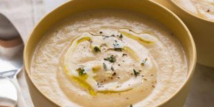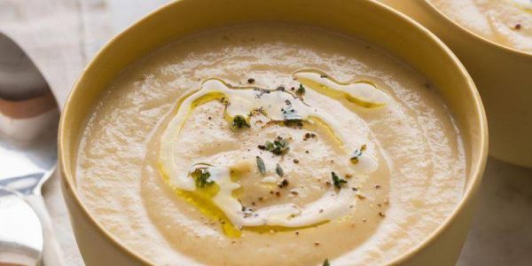 Взбейте содержимое кастрюли блендером до однородной кремовой консистенции. Если вы хотите подавать суп в кружках, то добавьте ещё немного молока, чтобы он был не слишком густым.