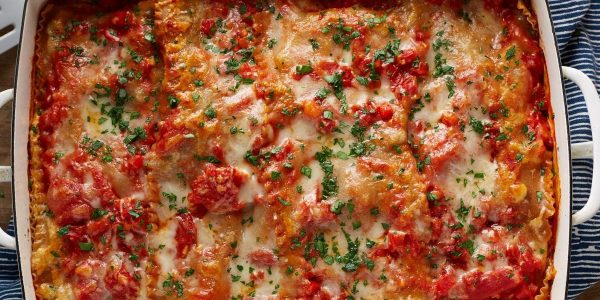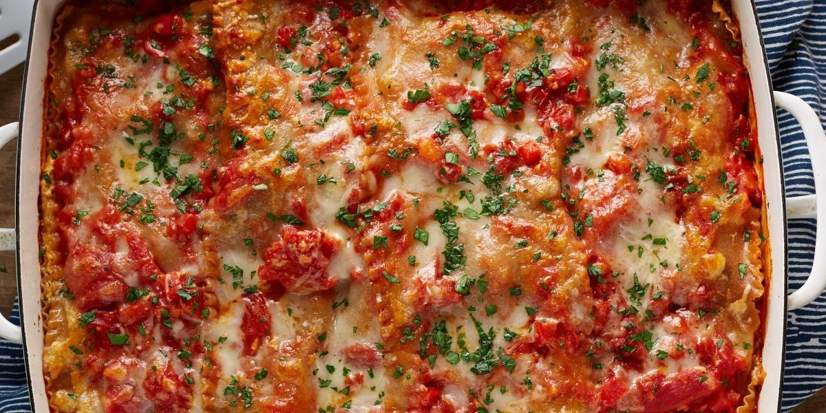 Накройте форму фольгой и запекайте в духовке 20 минут. Затем снимите фольгу и запекайте ещё 10 минут, пока сыр не подрумянится. Перед подачей дайте лазаньеостыть 10 минут, чтобы она легче резалась, и посыпьте рублеными листьями петрушки.