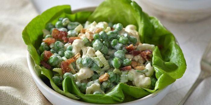 Сварите яйца вкрутую и нарежьте маленькими кубиками. Поджарьте бекон и нарежьте небольшими кусочками. В миске для салата смешайте майонез, горчицу, соль и перец. Выложите туда цветную капусту, яйца, измельчённый лук, размороженный горошек, нарезанные кубиками огурцы и бекон.
