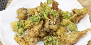 В конце обмакните в кляр листья петрушки и выложите в сотейник с маслом на 40 секунд.