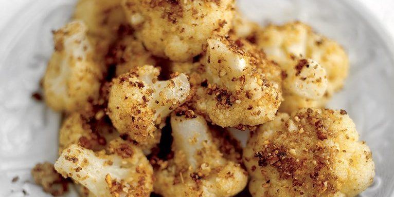 Измельчите зиру и кориандр. Смешайте их с молотым чили и солью. Добавьте к специям измельчённый миндаль, перемешайте и поджарьте на сухой разогретой сковороде. Через пару минут выложите туда соцветия цветной капусты, предварительно натерев их смесью оливкового и сливочного масел.