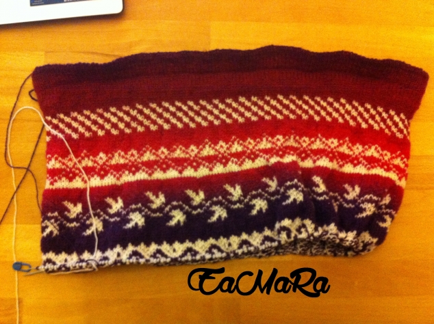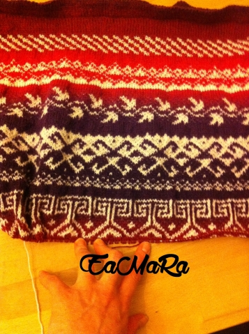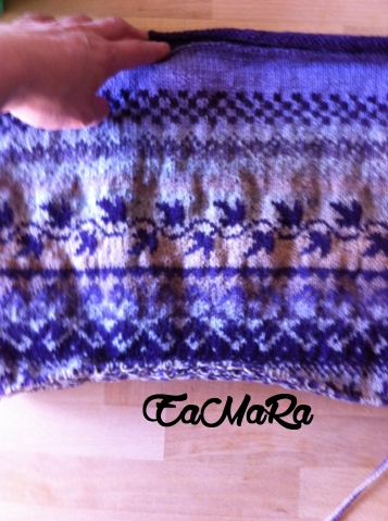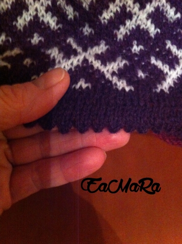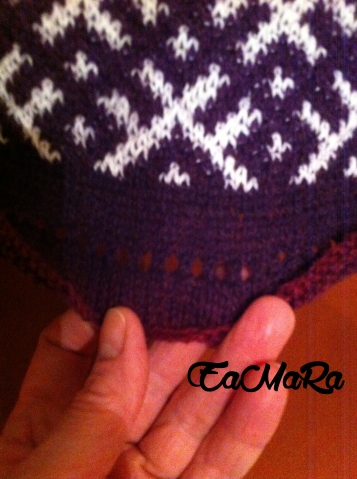 Окончив вязать 1-ю схему жаккарда, провязываем 4 ряда лицевой глади, причём в первом ряду равномерно прибавляем петли, что бы у нас получилось число петель кратное 10, т.к. раппорт 2-ой схемы равен 10 петлям.