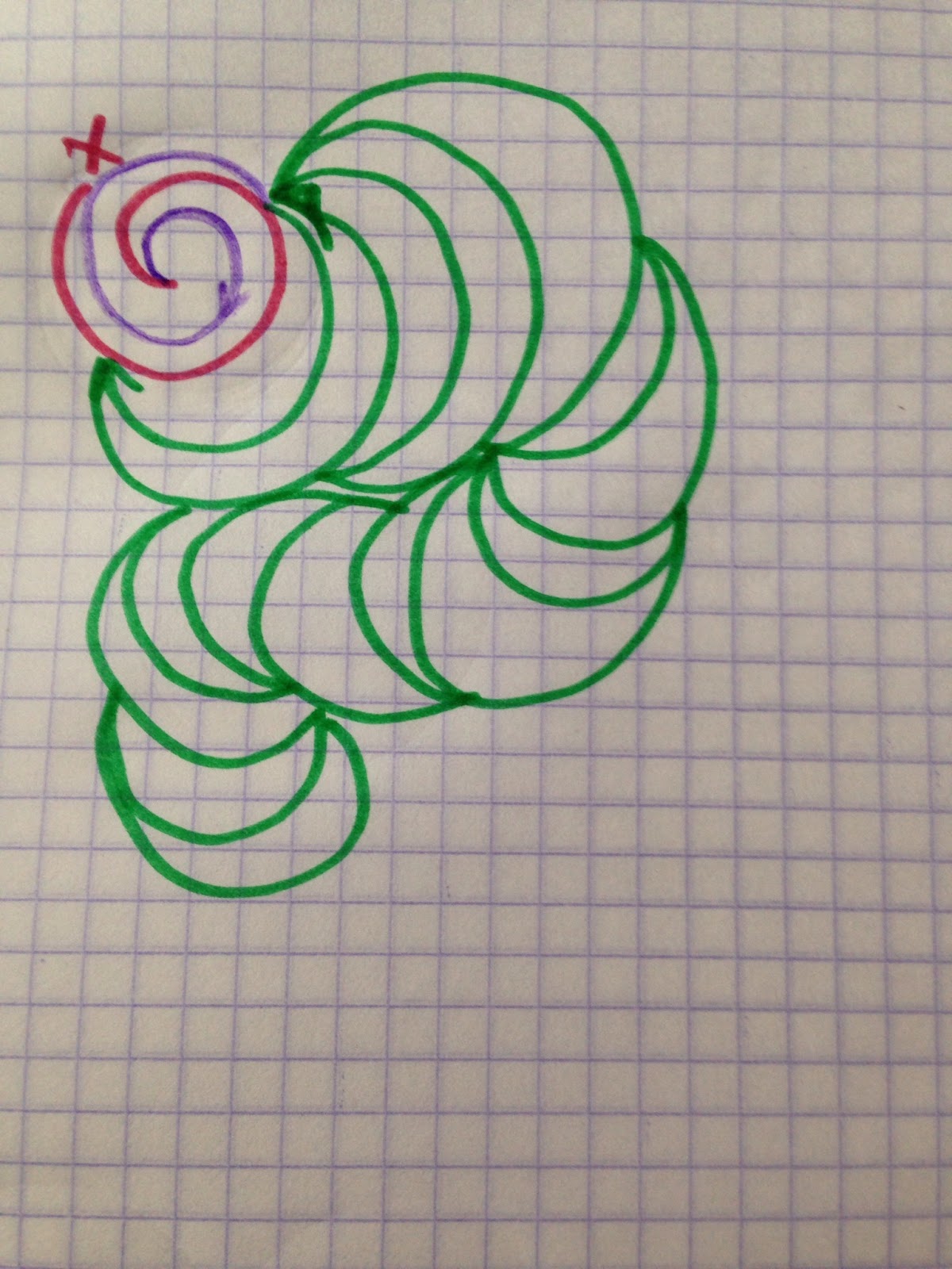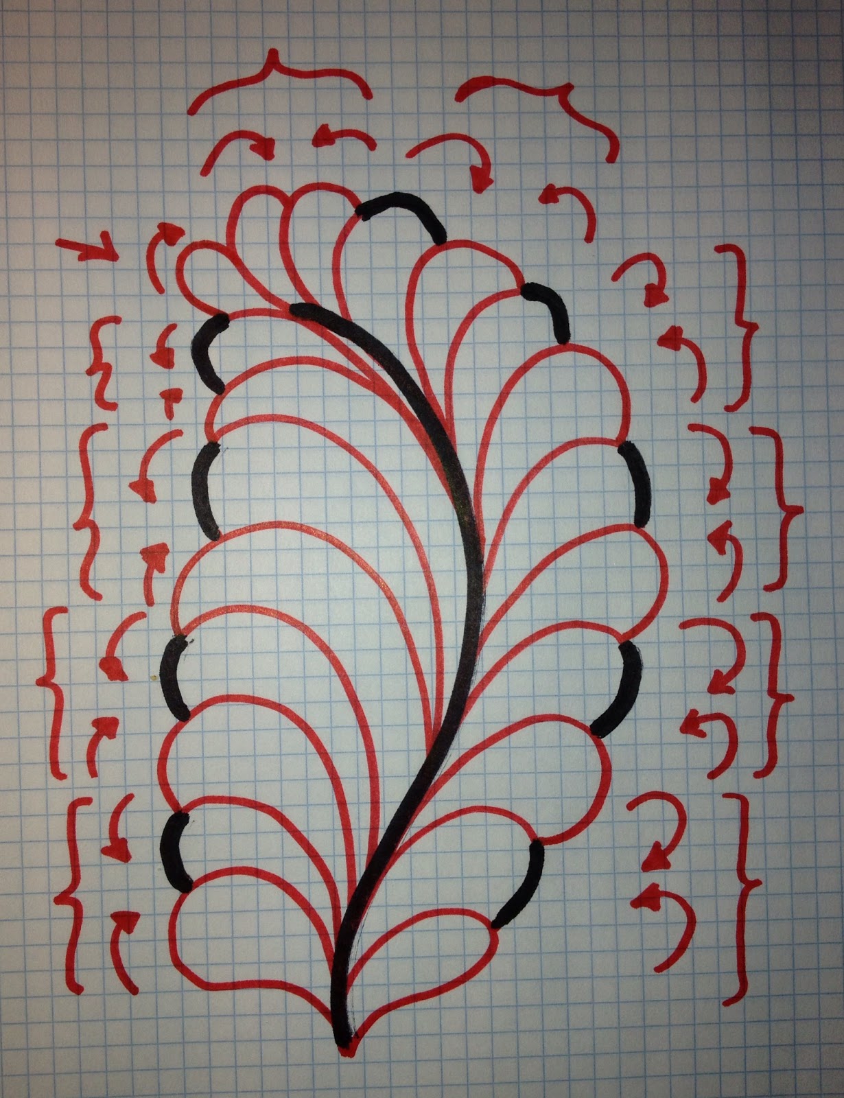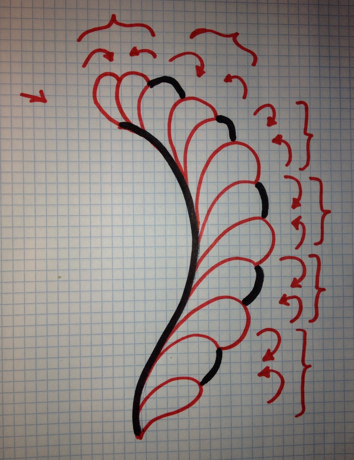 5) Перья.Перья - это те же "червячки"-"спиральки" из дуг, но со стеблем. И второе отличие: если у червячков дугу можно упирать в любое место предыдущей дуги, то для перьев важно УТКНУТЬ в предыдущий листок и ВЕРНУТЬСЯ НАЗАД по нарисованной линии.