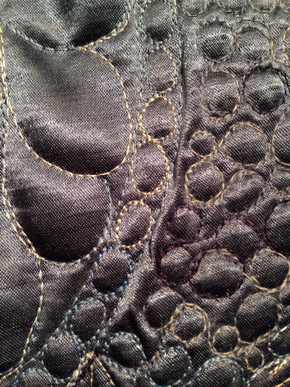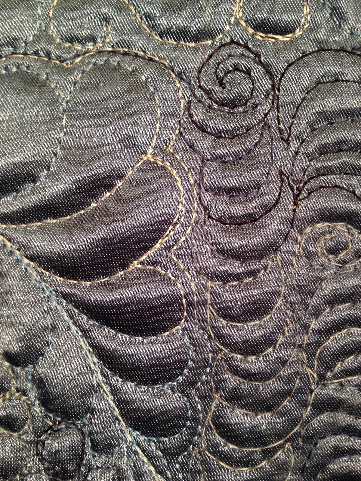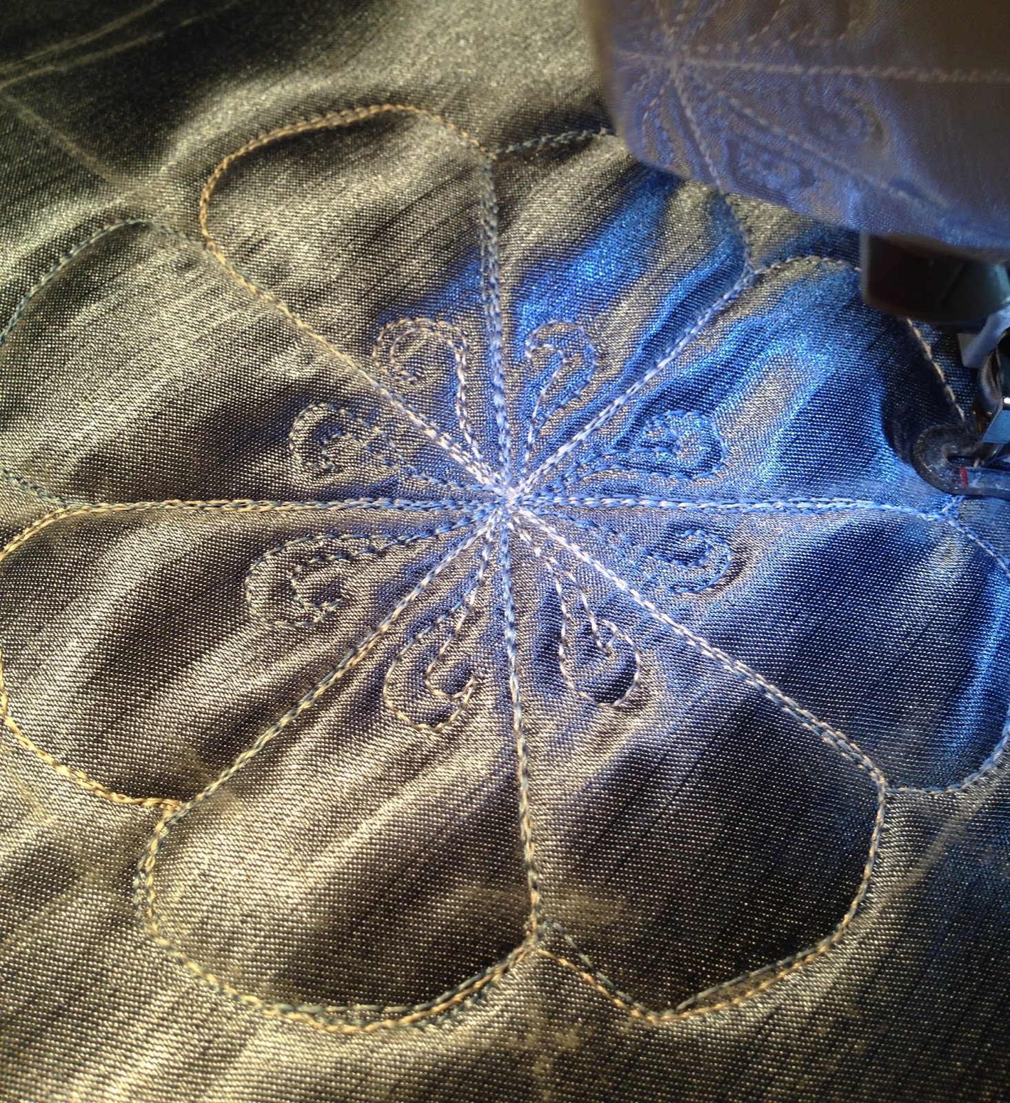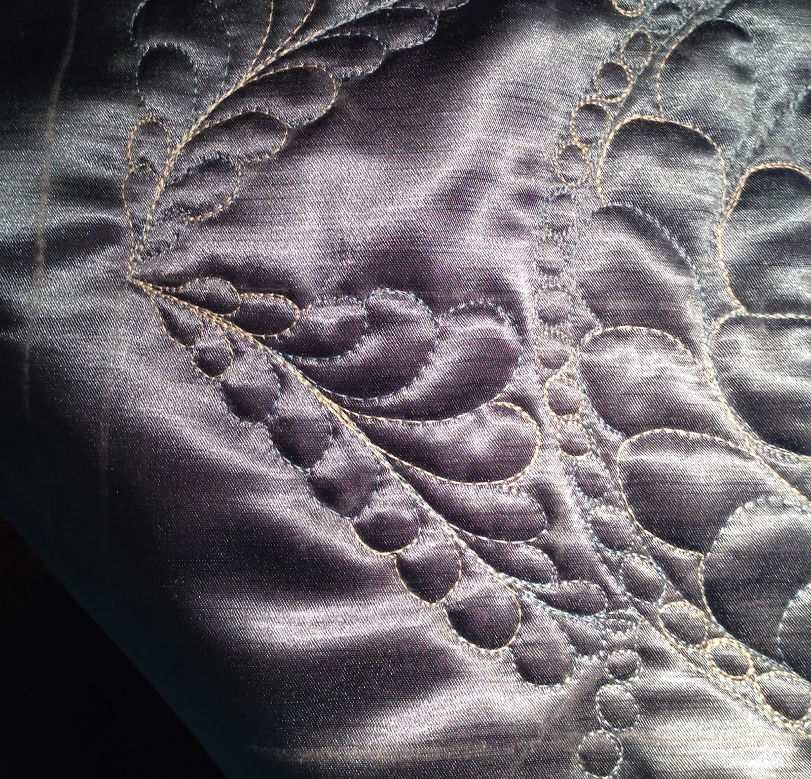 Попробовав постегать на образце, оставляю практически все нитки, что подходят по цвету. Здесь и полиэстер, и хлопок, и однотонные, и мультиколор. Квилт, действительно, хорошо скользит, и нитки не рвутся. Два обрыва - не в счёт! Нить рвётся и в прямой строчке.
