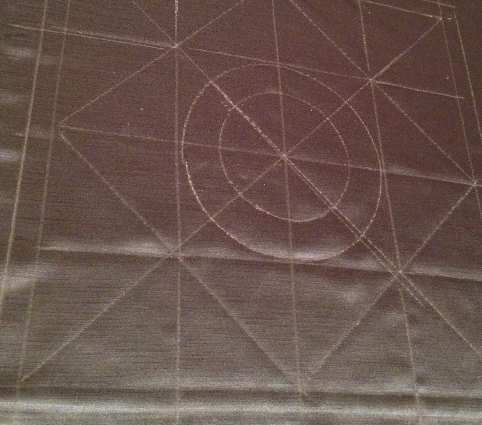 Вырезаю 3 квадрата: лицевая сторона, наполнитель, оборотная ткань. Размер 50 см Х 50 см. И рисую сетку. Зачем? Трафарета у меня нет. Ну и не надо! Всегда можно выйти из положения за счёт того, что есть в наличии. Как говорила секретарша Верочка, "нет ничего невозможного для человека с интеллектом". А есть в наличии: обмылок, линейки для пэчворка и блюдечко.