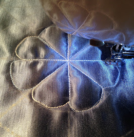 Подчиняясь этой "лёгкости бытия", выбираю ткань, которой раньше не стегала. Это обрезки шторной ткани. Ткань средней плотности: складки из этой ткани не стоят дыбом, а свободно колышатся.