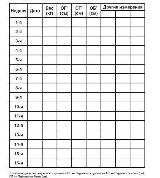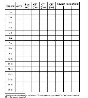 Тем кто только начинает трансформировать свое тело, то первую страничку расчертите либо распечатайте прикрепленную ниже картинку. По ней вообщем то все видно. Это контроль изменений вашего тела. Взвешиваться и измерять объемы лучше по воскресеньям, утром, без одежды в одно и тоже время, ну и само собой на пустой желудок, так вы точно будете знать вес вашего тела. Такой контроль поможет скорректировать ваши тренировки и питание.
